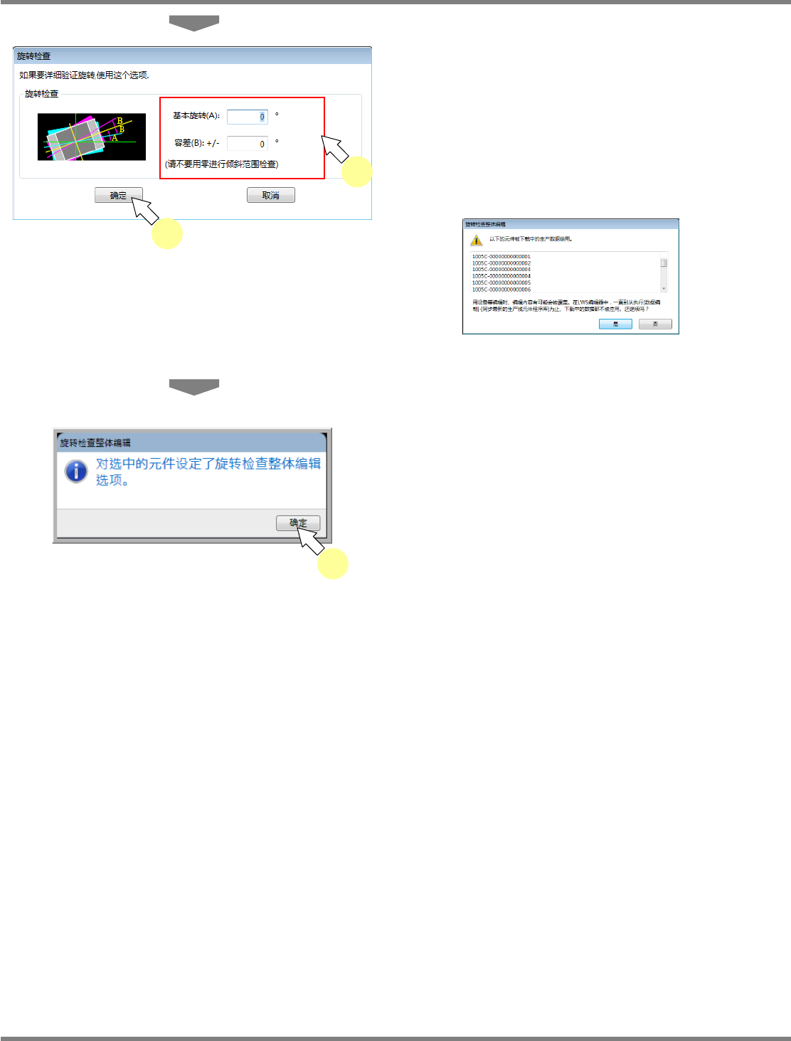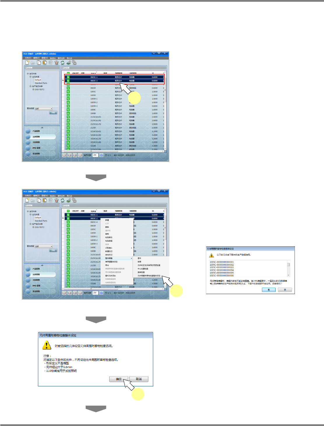 NPM-DGS 程序手册 6.7 现有元件的编辑 EJS9AC-MB-06P-24 Page 6-197 元件周围附着物检查 ( 整体设定 ) 在这个功能下,能够在元件管理画面 上设定元件周围附着物检查 。 对主元件程序库、生产线元件程序库 中的任何一方的元件都可进 行设定。 1 选择想要进行整体编辑的元件。 选择多个时, 在按 [Shift] 键或 [Ctr l] 键的同时选择 元件。 2 选择右击菜单上的 [ 整体编辑 ] …