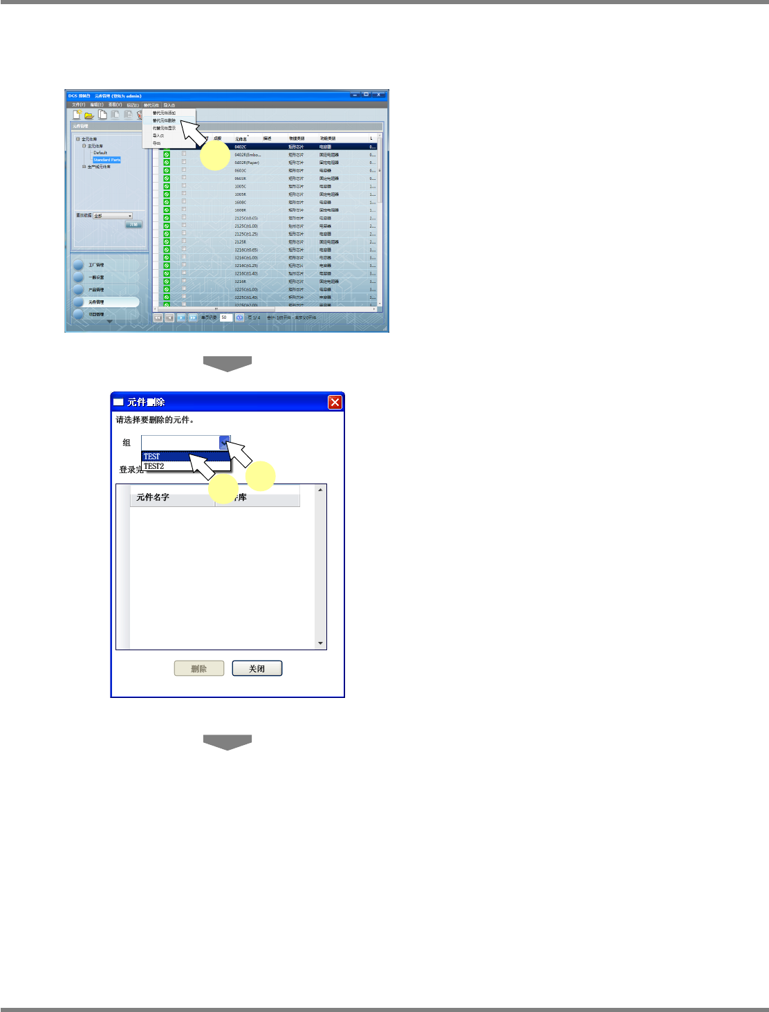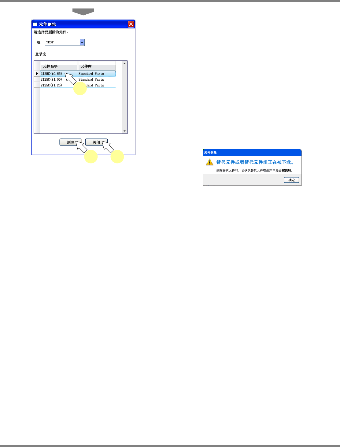 NPM-DGS 程序手册 6.8 代替元件的设定 Page 6-208 EJS9AC-MB-06P-24 3 选择要删除的元件。 4 点击 [ 删除 ] 。 当删除了组内的全部替代元件时,组 自身也会 被删除。 5 点击 [ 关闭 ] 。 将会关闭 < 元件删除 > 画面。 当在下载数据中使用删除了替代元件 的组时, 将显示以下对话框。 ( 只在已下载完毕的生产线 元件上显示。 ) Parts060802S-0 …