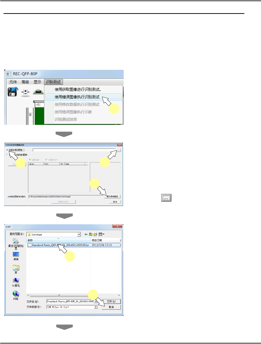 NPM-DGS 程序手册 6.9 使用设备识别错误图像执行识别测试 Page 6-214 EJS9AC-MB-06P-24 6.9 使用设备识别错误图像执行识别测试 修正数据之际的识别测试 ( 选择任意图像时 ) 在使用本功能之前,请先在设备上获 取相应元件的识别画像数据 。 1 打开测试元件的编辑画面。 请参照 ‘6.7 现有元件的编辑 ’ 。 2 通过菜单栏选择 [ 识别测试 ] [ 使用错 误图像执行识别测试 ] …