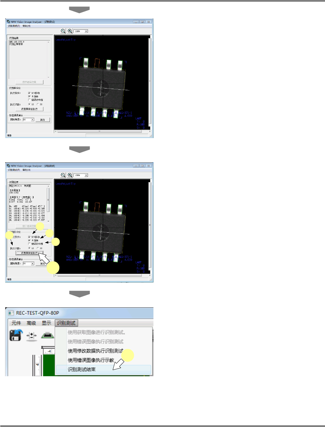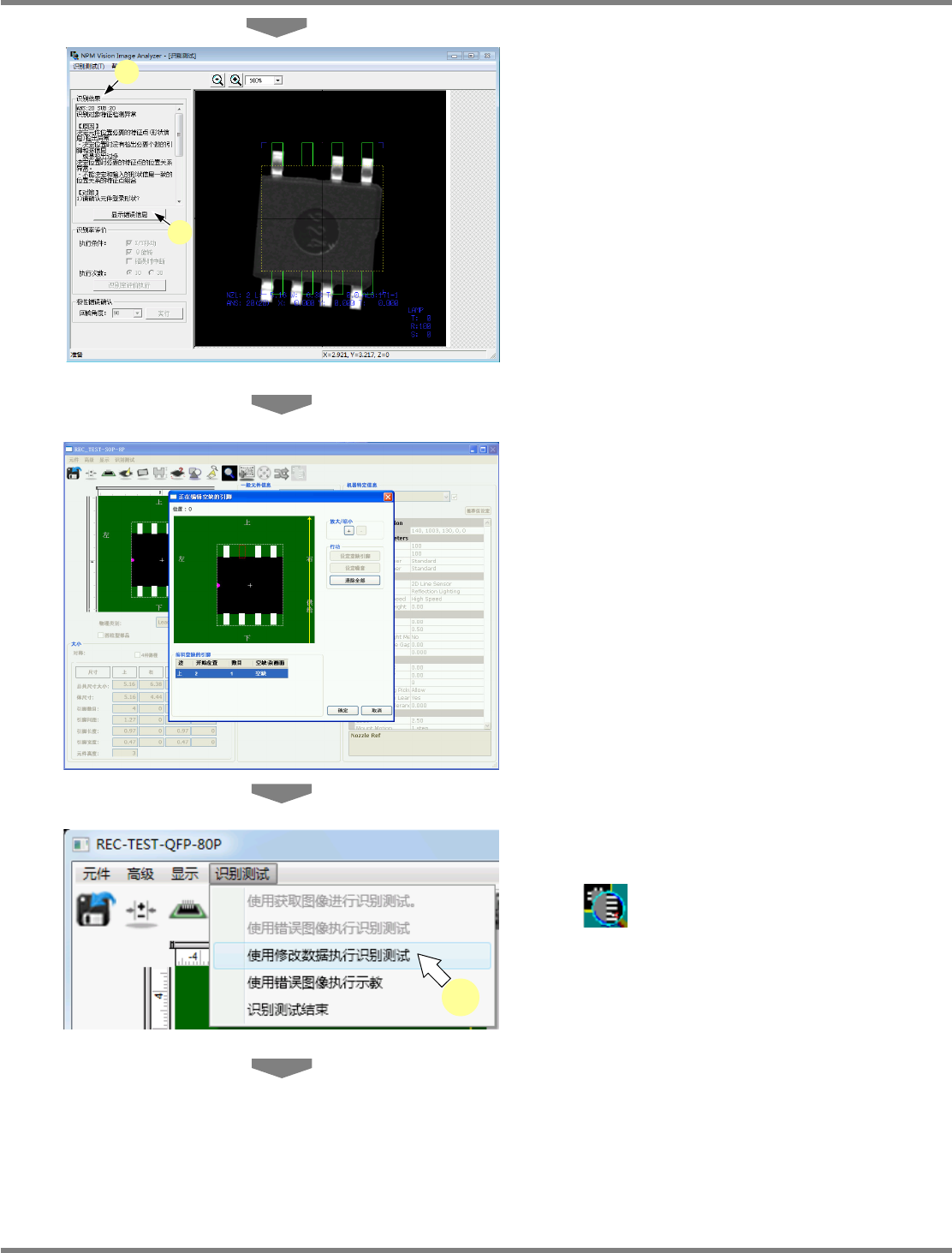 NPM-DGS 程序手册 6.9 使用设备识别错误图像执行识别测试 Page 6-216 EJS9AC-MB-06P-24 将显示经修正数据修改后的识别结果 。 如果仍得不到解决,请再次在编辑项 目下修改 数据,并再次执行识别测试。 10 点击 [ 识别率评价执行 ] ,或选择菜单栏 的 [ 识别测试 ] [ 使用修改数据执行识 别测试 ] 后, 反复执行识别来确认数据的 可靠性。 e. ‘X/Y 移动 ’ 如果复选框内打勾…