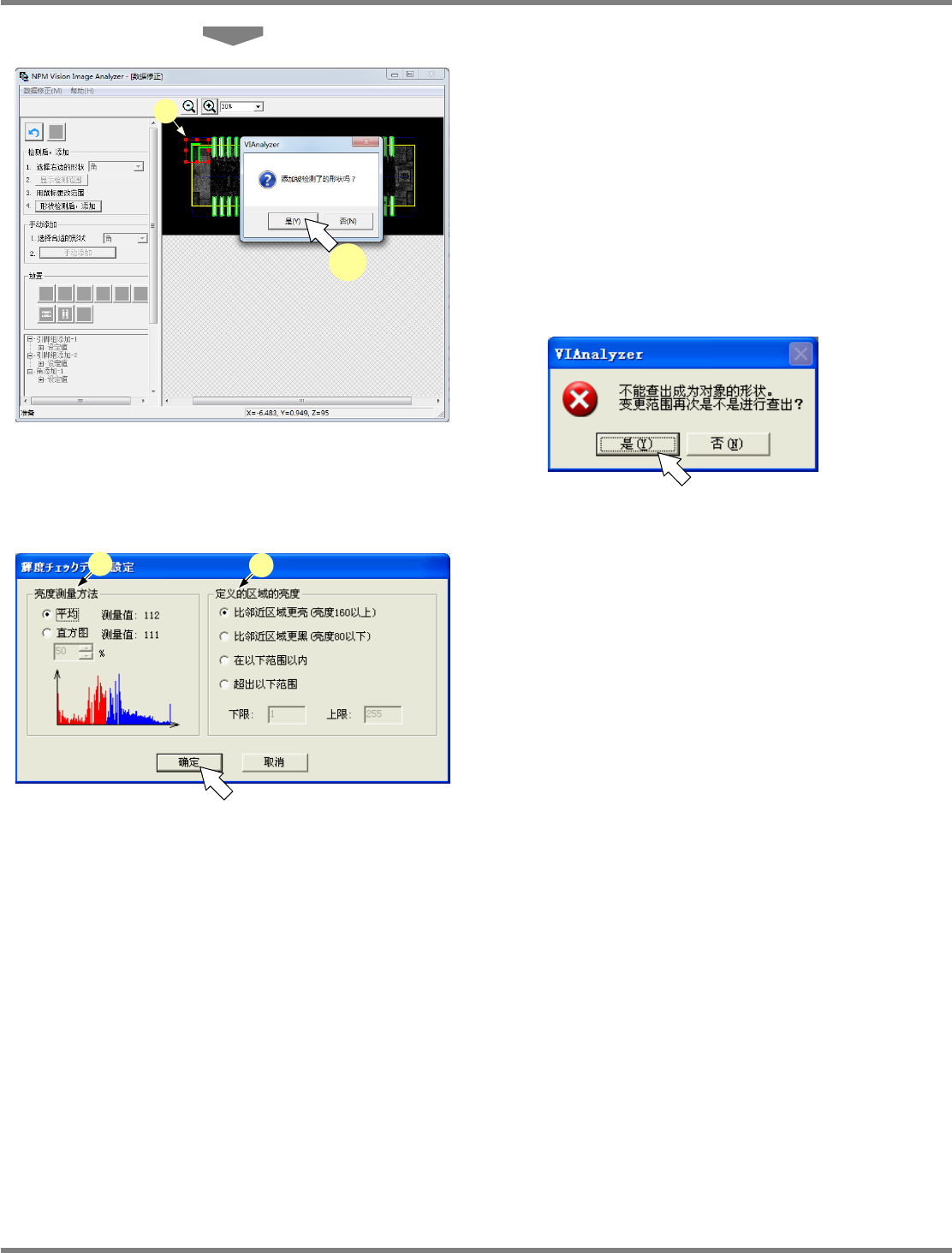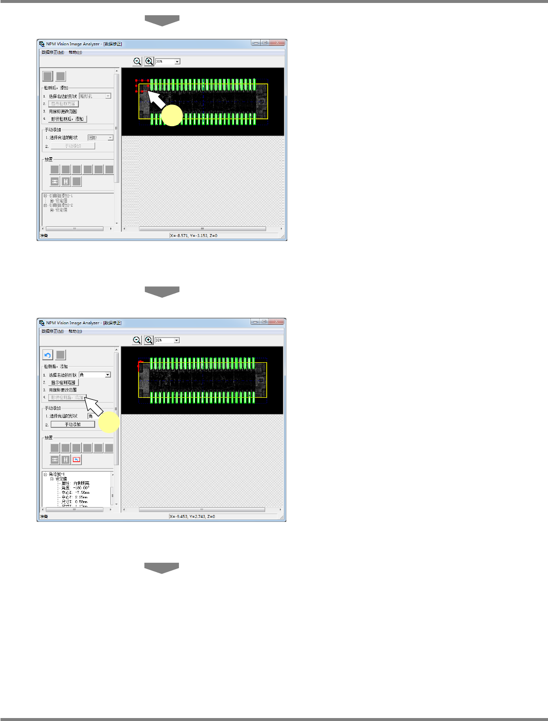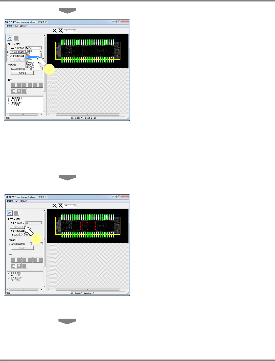 NPM-DGS 程序手册 6.9 使用设备识别错误图像执行识别测试 EJS9AC-MB-06P-24 Page 6-221 5 拖拉检测范围框来调整检测添加对象 的范围。 请在添加对象的对比度较好的部分上 设定检测 范围。 6 或点击 [ 形状检测后,添加 ] ,或选择菜 单栏的 [ 数据修正 ] [ 形状检测后,添 加 ] 来检测范围内的添加对象。 Parts060901S-1 4C01 5 Parts060901S-1 5C…