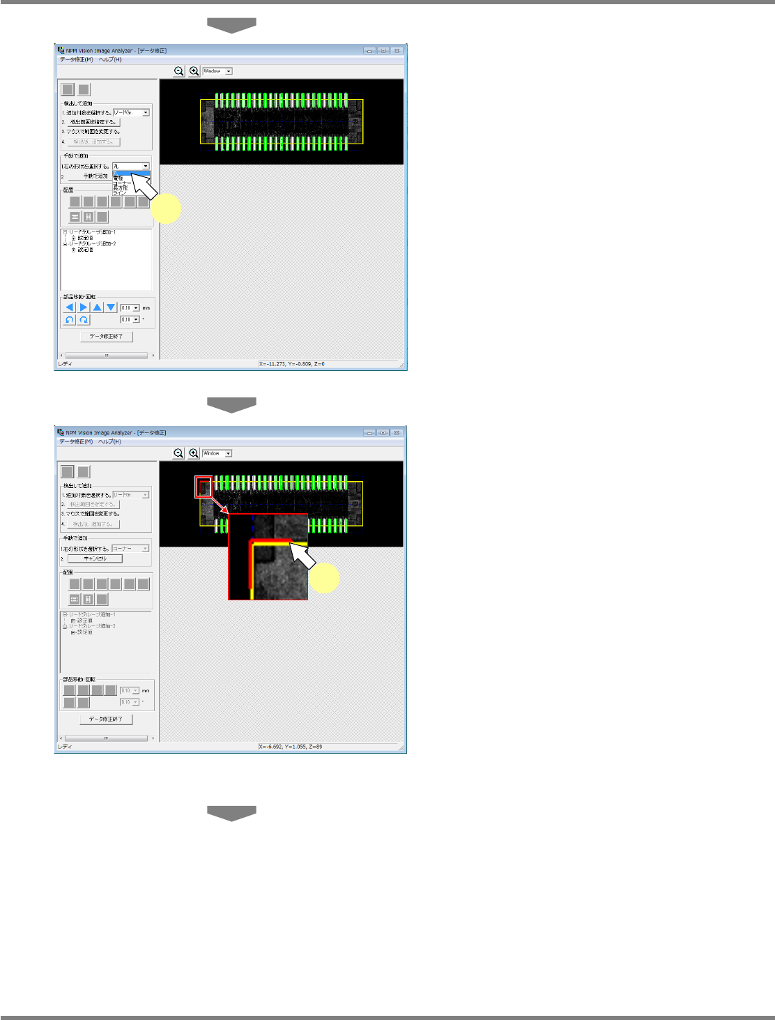 NPM-DGS 程序手册 6.9 使用设备识别错误图像执行识别测试 Page 6-222 EJS9AC-MB-06P-24 7 检测到添加对象时,将会显示信息窗 口。点击 [ 是 (Y)] 。 如果点击 [ 否 (N)] ,即会不添加而结束。 在元件图像上以红色线的 e. 形状区块显示添加 的形状。 如果没有检测到添加对象, 将会显示信息窗口。 请点击 [ 是 (Y)] 并重新调整检测范围。 需要对添加对象指定亮度检查时…