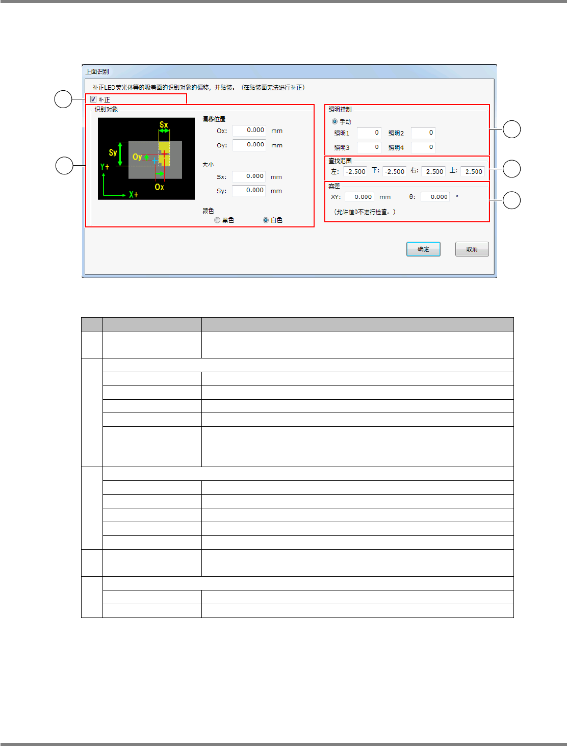 NPM-DGS 程序手册 6.12 头照相机识别选项 Page 6-240 EJS9AC-MB-06P-24 6.12.3 上面识别 对 LED 元件等所拥有的萤光体执行头照相机识别 后进行吸着,由此可通过补 正使萤光体的中心转 为贴装位置。 设定项目 No. 名称 说明 1. ‘ 补正 ’ 对元件进行 ‘ 上面识别 ’ 的设定。 无需设定时,请不要勾选复选框。默 认值为 ‘ 勾选 ’ 状态。 2. ‘ 识别对象 ’ ‘Ox’ …