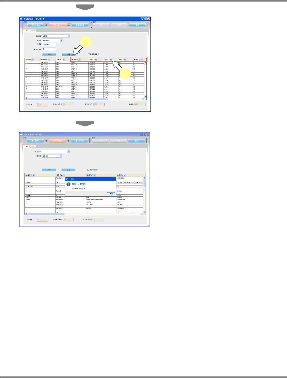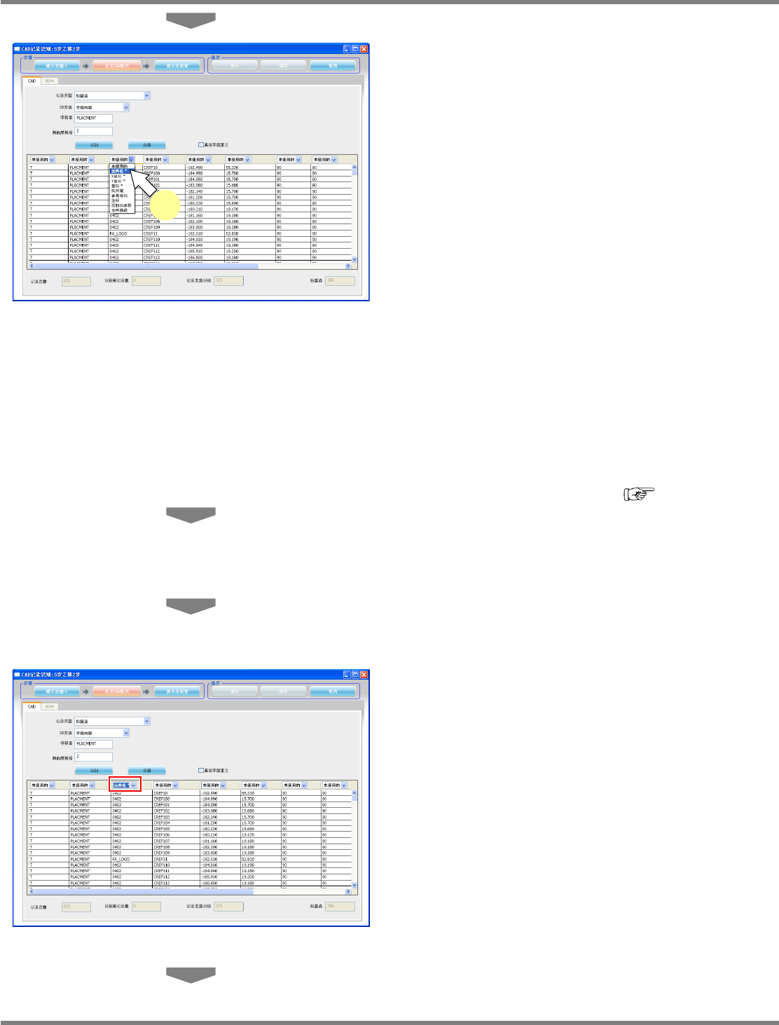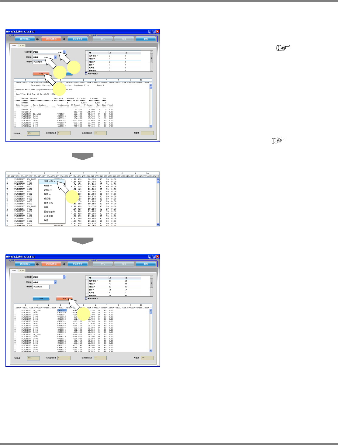 NPM-DGS 程序手册 5.2 CAD 宏的定义 EJS9AC-MB-05P-25 Page 5-47 4 通过同样操作对其它字段也进行定义。 • X 坐标 ( 第 5 列 ) • Y 坐标 ( 第 6 列 ) • 旋转 ( 第 7 列 ) • 参考号码 ( 第 4 列 ) • 贴片端 ( 第 1 列 ) 5 应用定义。 点击 [ 应用 ] ,将保存定义。 请重复进行以上的步骤, 对每个记录类型进行定 义。 Project0502…