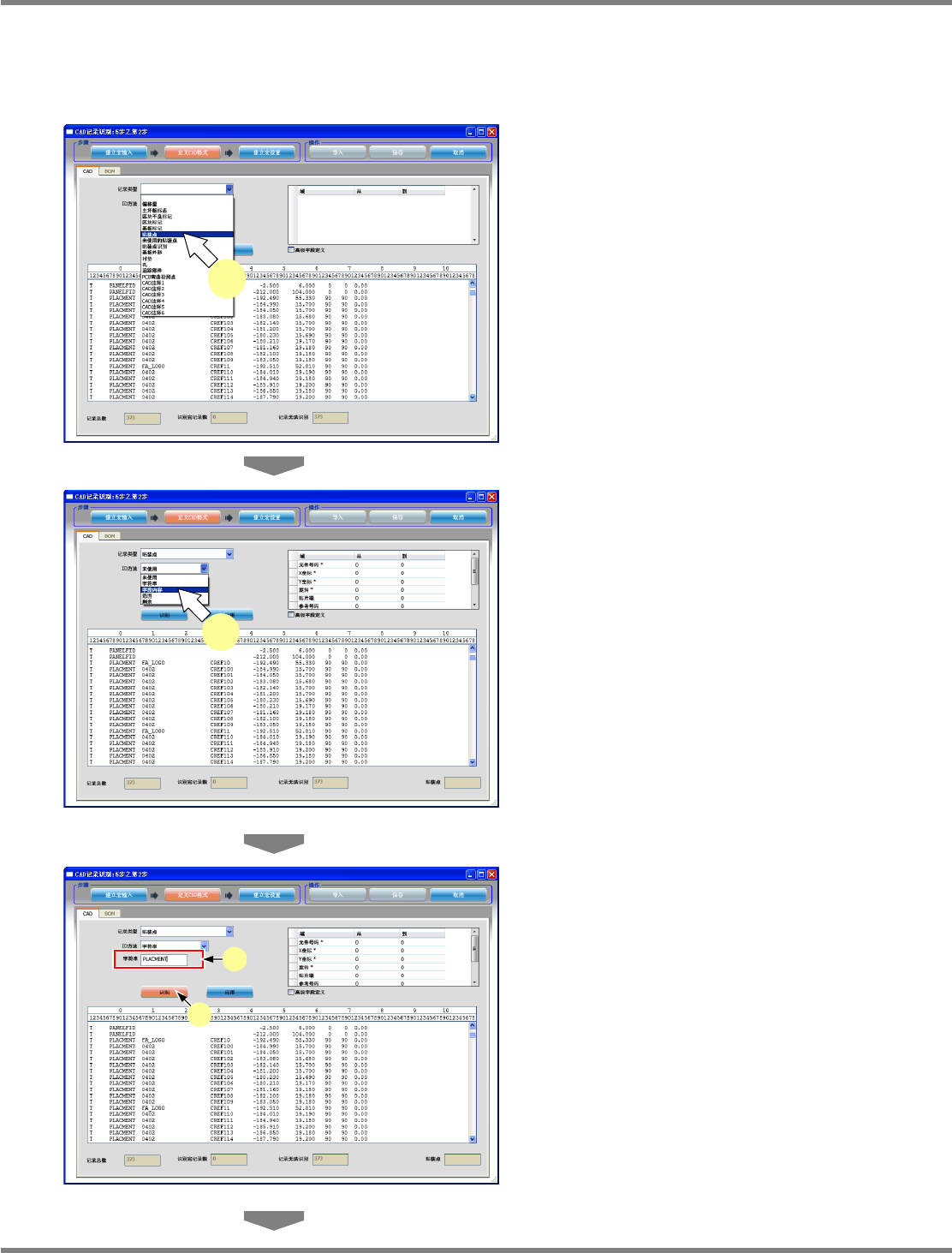 NPM-DGS 程序手册 5.2 CAD 宏的定义 Page 5-48 EJS9AC-MB-05P-25 使用位置指定 CAD 文件时的 CAD 格式的定义 1 选择定义的记录类型。 关于可设定的 ‘ 记录类型 ’ ,请参照 ‘5.2.1 CAD 宏编辑器 ’ ‘2. CAD 格式定义 ’ ‘ CAD 标签 ’ ‘ 记录类型和字段定义的关系 ’ 。 我们推荐首先定义实装点记录。 显示出来的字段,根据选…