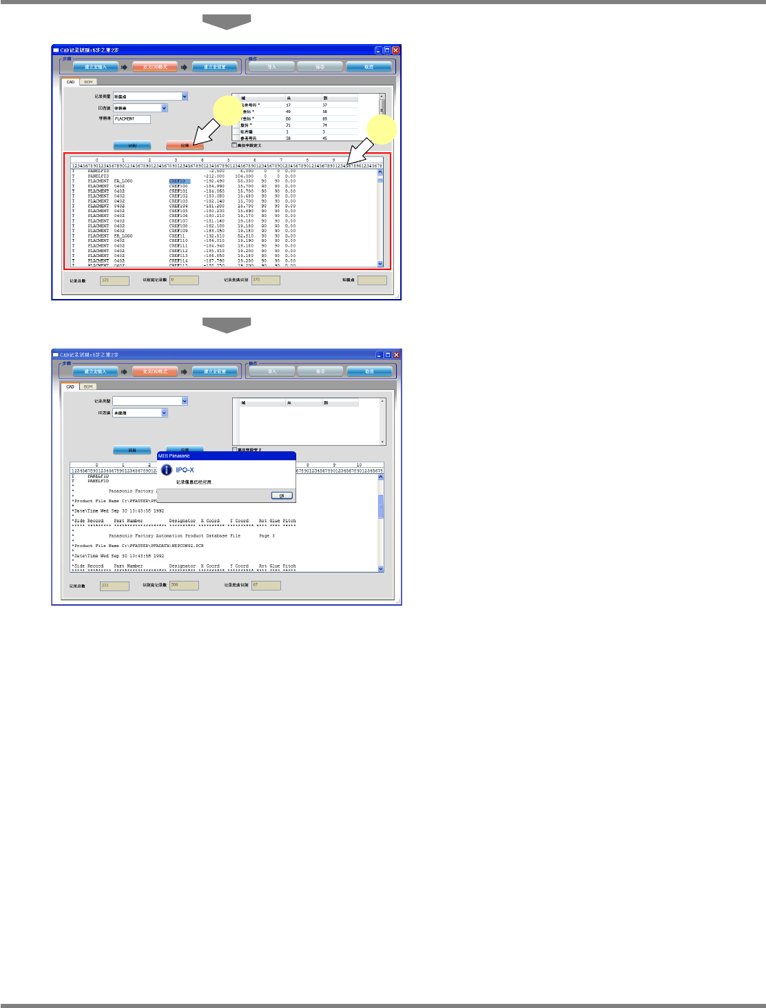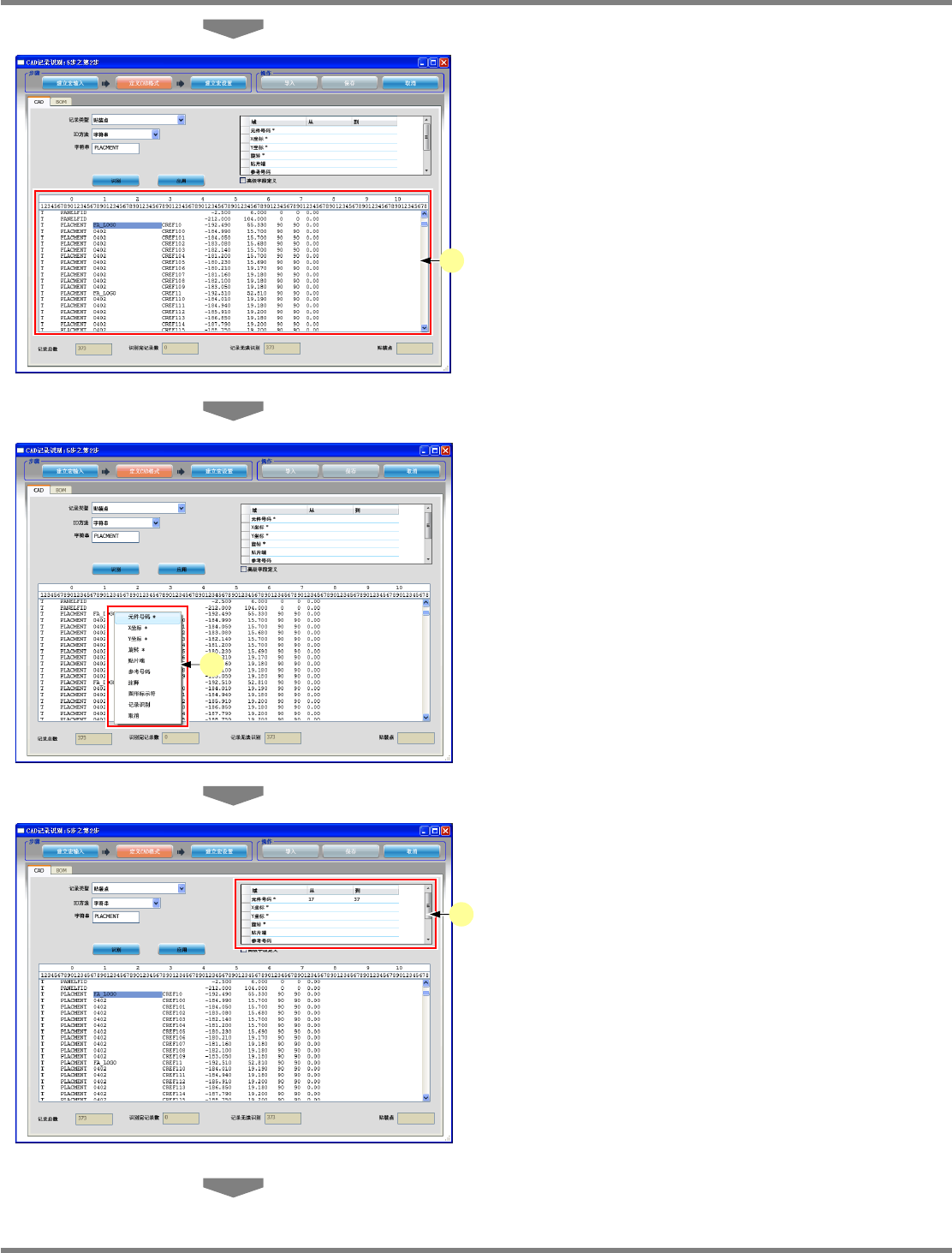 NPM-DGS 程序手册 5.2 CAD 宏的定义 EJS9AC-MB-05P-25 Page 5-51 4 通过同样操作对其它字段也进行定义。 • X 坐标 (49 位数 ~ 58 位数 ) • Y 坐标 (60 位数 ~ 69 位数 ) • 旋转 (71 位数 ~ 74 位数 ) 5 应用定义。 按 [ 应用 ] 即可保存定义。 请重复进行上述操作, 按照每个记录类型分开进 行定义。 Project050201S-5 3C00 …