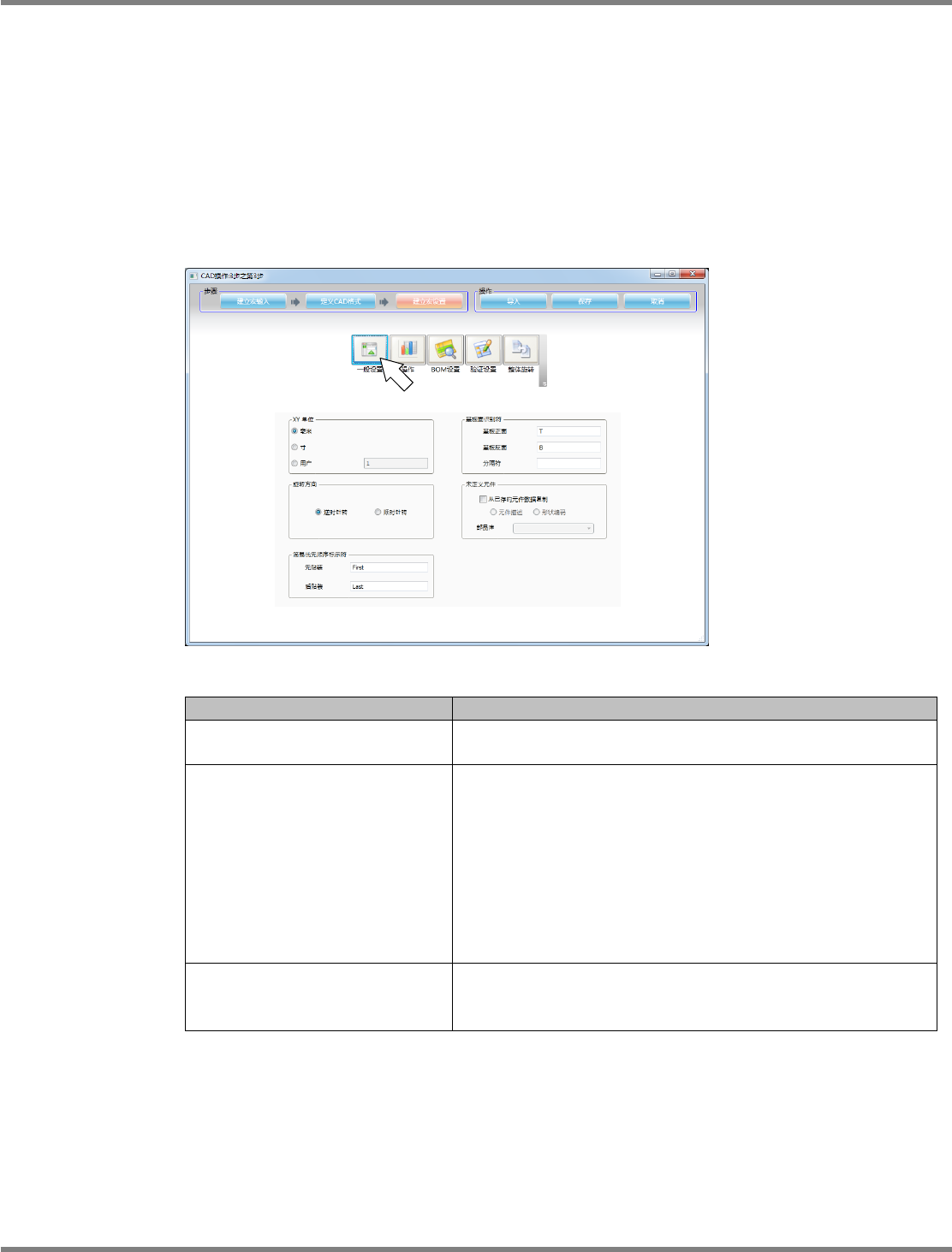 NPM-DGS 程序手册 5.2 CAD 宏的定义 EJS9AC-MB-05P-25 Page 5-63 3. 宏定义的详细设定 用 ‘ 建立宏设置 ’ 步骤,定义获取 CAD 时的详细设定。 ‘ 建立宏设置 ’ 步骤有以下 5 个标签。 • 全面 • 操作 • BOM • 检查内容 • 角度符号 全面标签 定义在获取 CAD 时的基本设定。 设定项目 项目 说明 ‘XY 单位 ’ 选择在 CAD 文件上使用的单位。 使用用户选…