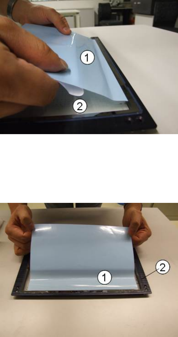 A CT mit SSW 6xx / Bedienungsanleit ung Ausgabe 07/2017 15 ► Nehmen Sie ein Tuc h und streichen S ie die Folie in der Mit te beginnend sanft auf wie in Abbildung 3-6 und Abbi ldung 3-7 gezei gt. Abbildung 3-6: Klebetechn…