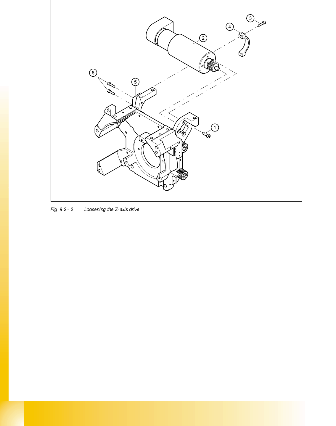 ➠ Undo the two M3x14 hexagon socket-head screws (item 6 in Fig. 9.2 - 4 of the motor clamp