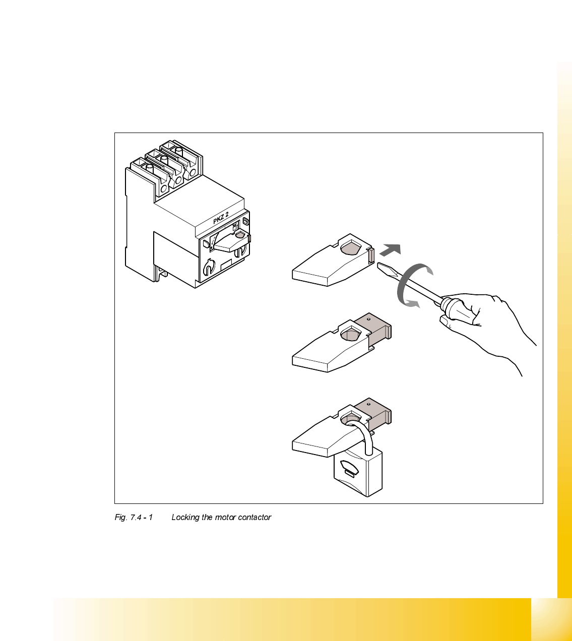 ➠ Switch off the motor contactor in the power supply unit and secure the operating lever with a