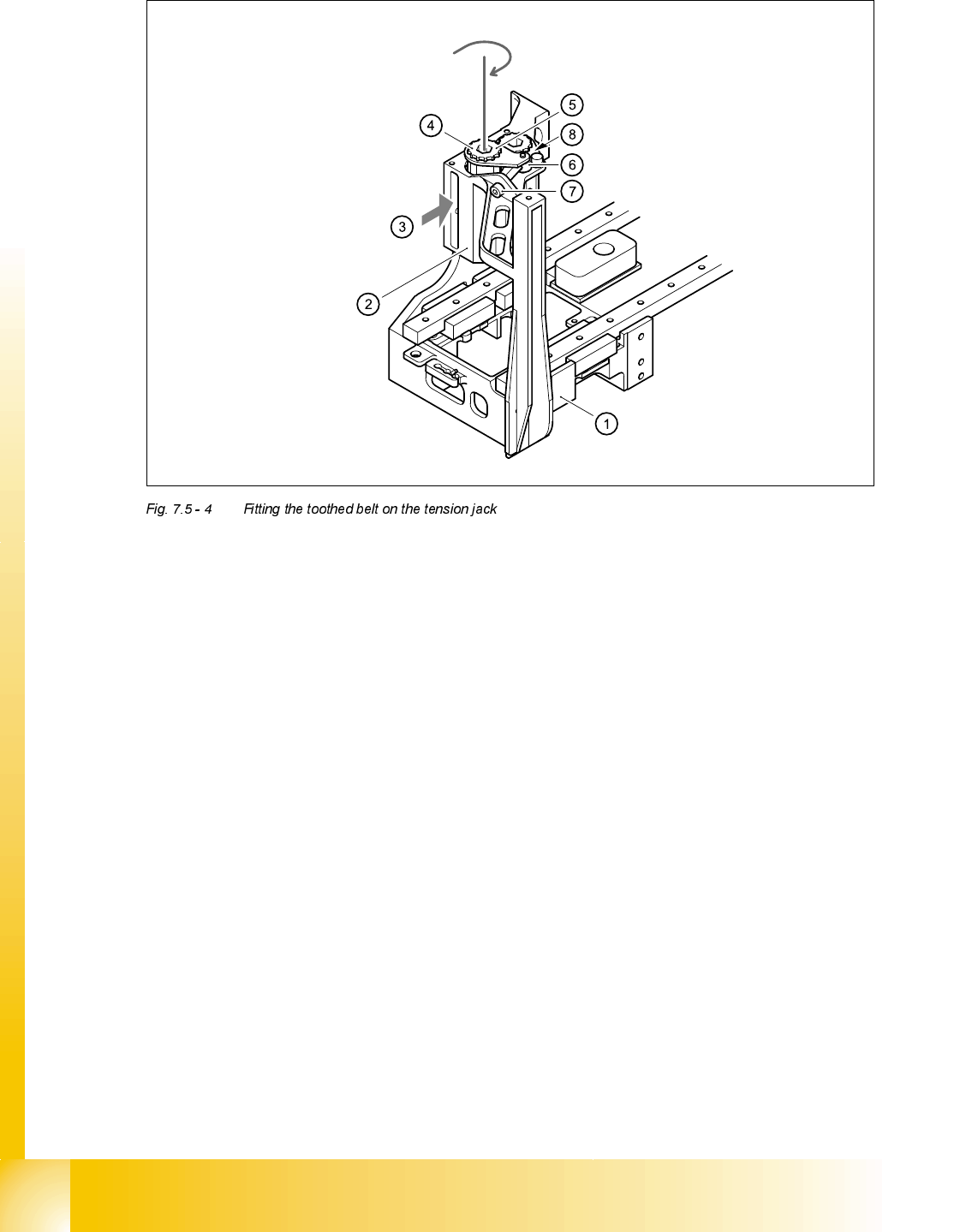 ➠ Feed the toothed belt into the opening (item 3 in Fig. 7.5 - 4) in the tension jack (item 2 in Fig.