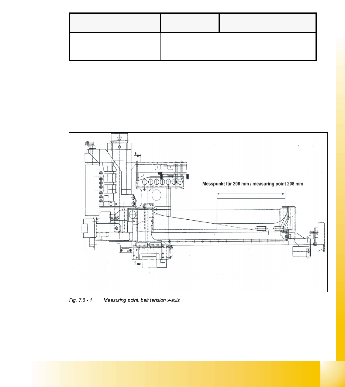 ➠ Center the measuring pin of the belt tension measuring device, 208 mm away from the