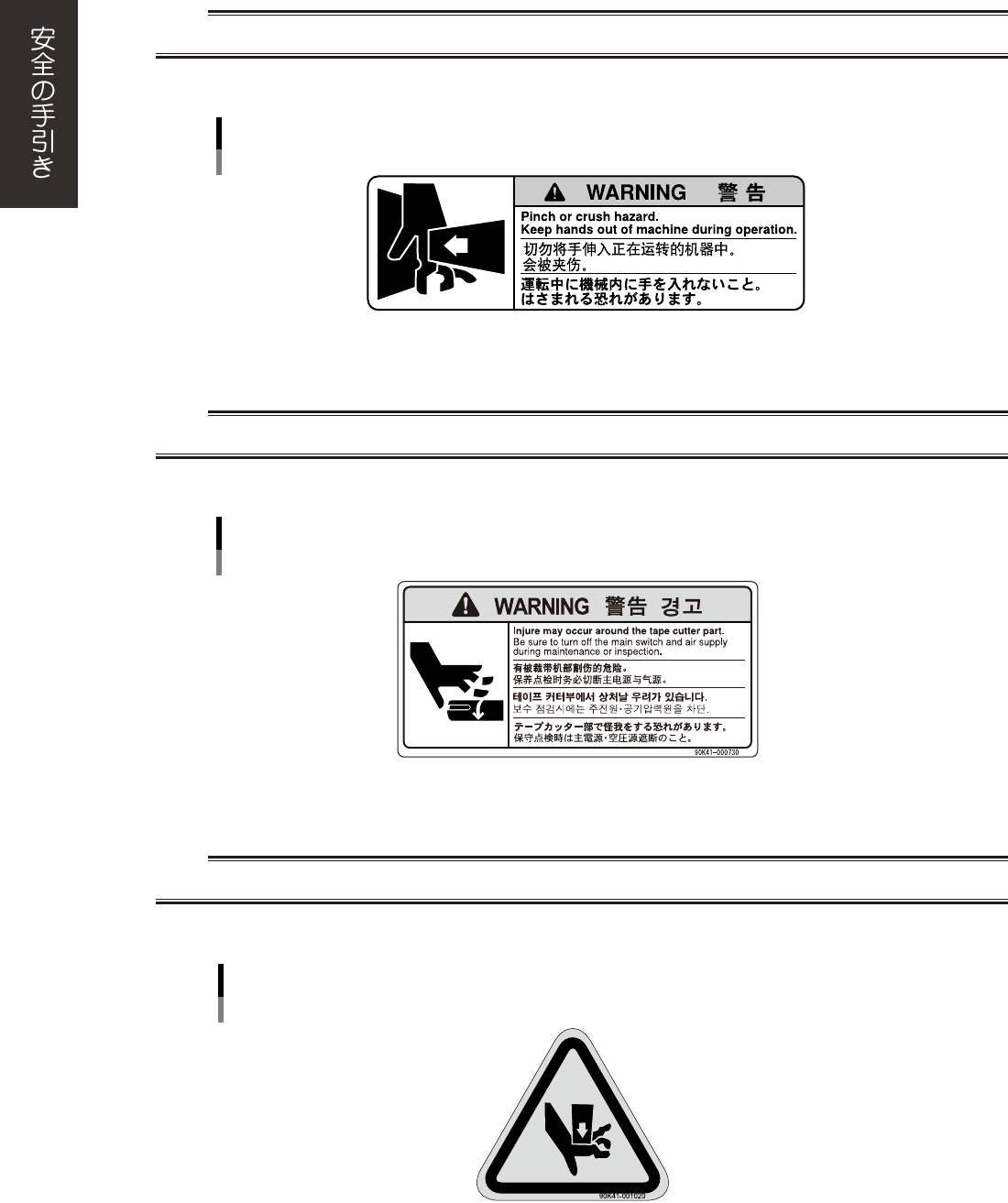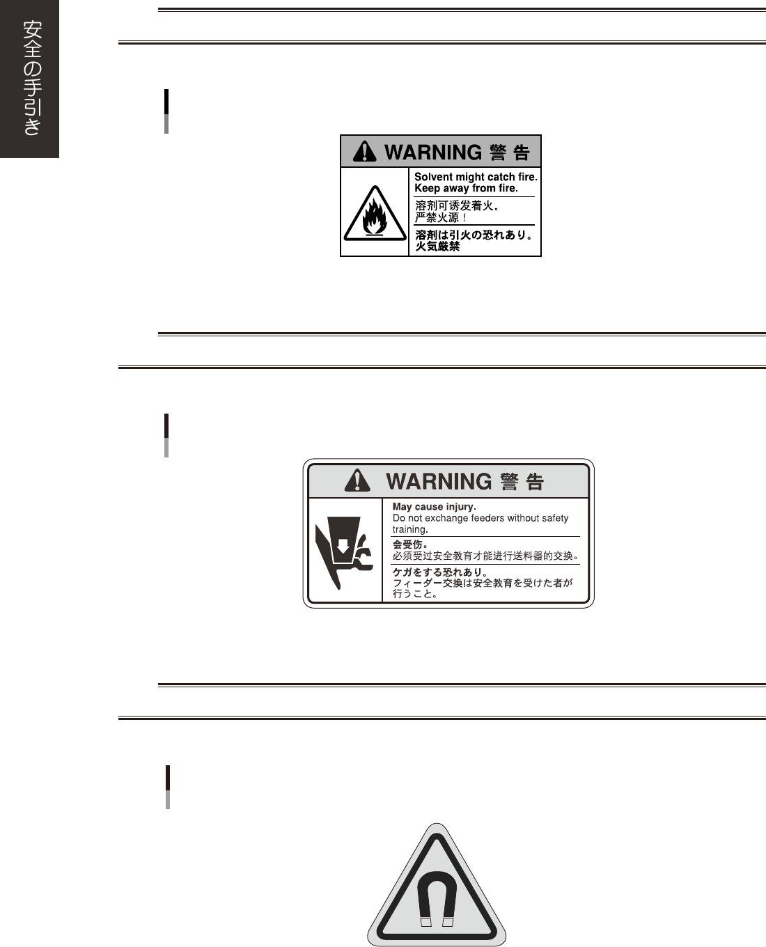 xiii ■警告内容 w 警告 マガジンを取り扱う際、手などを絶対にマシン内に入れない。可動部に手や指を挟まれてケガをする恐れがあります。 ■ 対象マシン トレイチェンジャー (YG シリーズ、YS シリーズ ) 挟んでケガをする恐れあり 90K41-000470 ■警告内容 w 警告 放電針に手を触れない。分解しない。水をかけない。感電する恐れがあります。 ■ 対象マシン マウンター全機種 可造成触电和故障的原因。 别用手触摸电极…