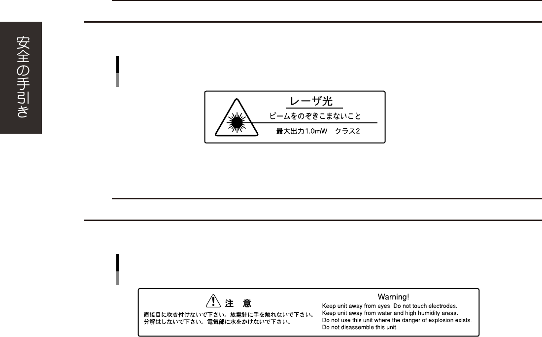 xv 3.2 注意表示 3.2.1 人体への影響 ■注意内容 c 注意 カバー内の電源部に触れると感電する恐れがありますので注意してください。 ■ 対象マシン 全てのマシン 高圧注意 触れると感電の恐れあり 91101-LC-00 ■注意内容 c 注意 可動部のモーターは高温になりますので触らないでください。 ■ 対象マシン 全てのマシン 高温注意 触れるとやけどの恐れあり 91102-LC-00
