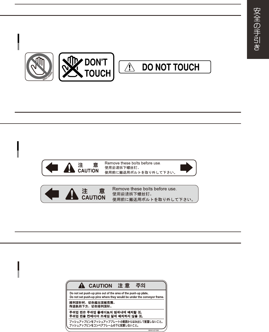 xvi ■注意内容 c 注意 レーザー光を直視すると失明する恐れがあります。 ■ 対象マシン IT オプション バーコードリーダー 失明する恐れあり 91103-LC-00 ■注意内容 c 注意 直接目に吹き付けないでください。分解したり放電針に触ったりしないでください。 ■ 対象マシン イオナイザー装備マシン ( オプション ) 直接目に吹き付けない 91104-LC-00