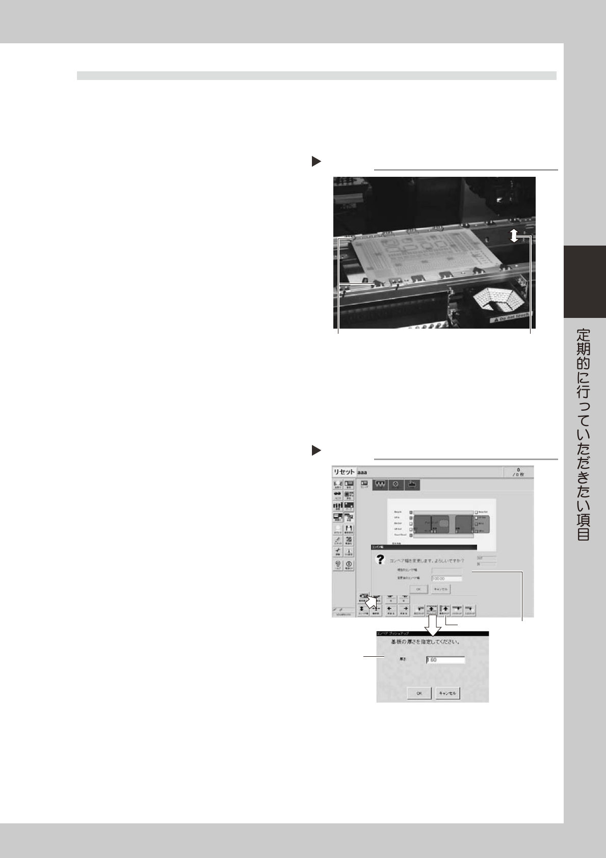 3-5 3 1.3 基板クランプの状態 ・ 動作確認 1.3.1 基板クランプ状態の確認 基板のクランプ状態に関して下記の項目を確認してください。 1. 基板クランプしたときに、基板にがたつきがないか。 2. 基板クランプしたときに、基板押さえプレートと基 板との間に隙間がないこと。 3. 基板クランプしたときに、コンベアレール上面と基 板とで段差が発生していないこと。 4. 基板クランプユニットの動作がスムーズに動作する こと。 …
