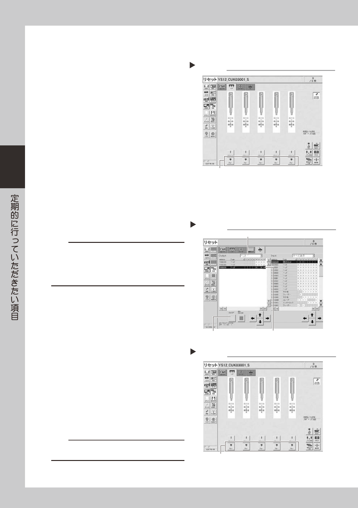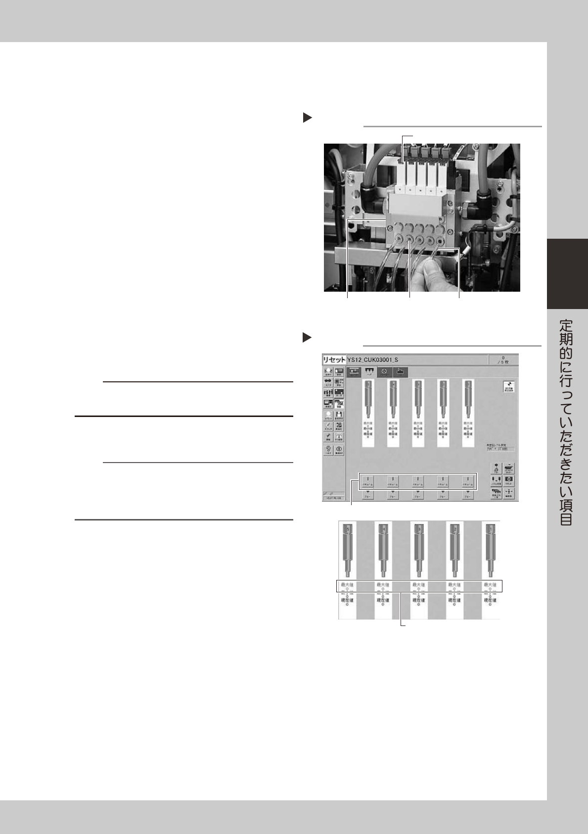 3-17 3 3.1.1 エジェクター真空圧力の点検 エジェクターユニットの各エジェクター単体の真空レベルを確認し、状態を判断します。 e 1 非常停止ボタンを押します。 作業を安全に行うために、必ずマシンを非常停止 状態にしてください。 2 エジェクター下部のエアジョイントか らエアホースを外します。 エジェクター下部のエアジョイントからエアホー スを全て外してください。 51333-L6-00 3 エジェクター単体の真空レベルを確…