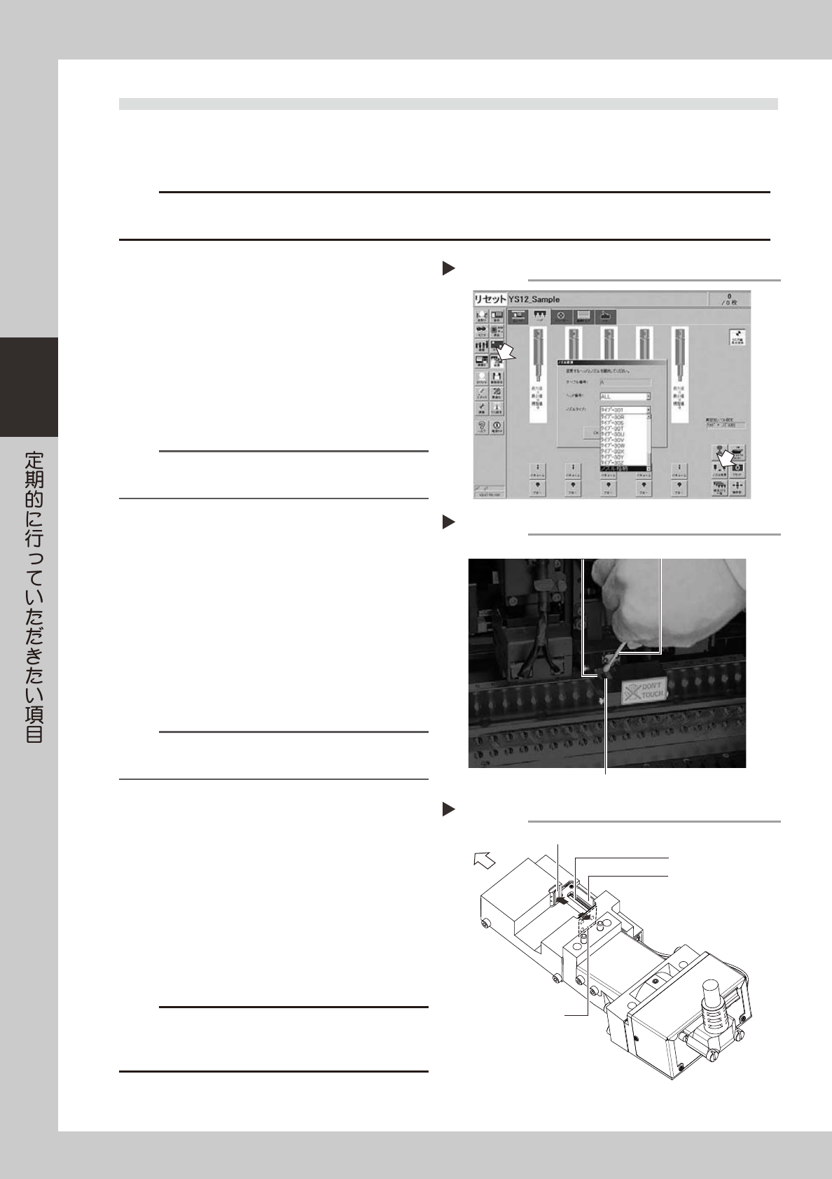 第 4 章 消耗品の交換方法 目次 1. ノズル板バネの交換 4- 1 2. エジェクター部 4- 2 2.1 エジェクター BIT の交換 4- 2 2.2 ソレノイドコイルの交換 4- 3 2.3 清掃用ブローバルブの交換 4- 4 3. 基板搬送部の清掃とベルト交換 4- 5 4. 給油箇所一覧表 4- 7 4.1 X 軸リニアガイドとボールスクリュー 4- 7 4.2 Y …