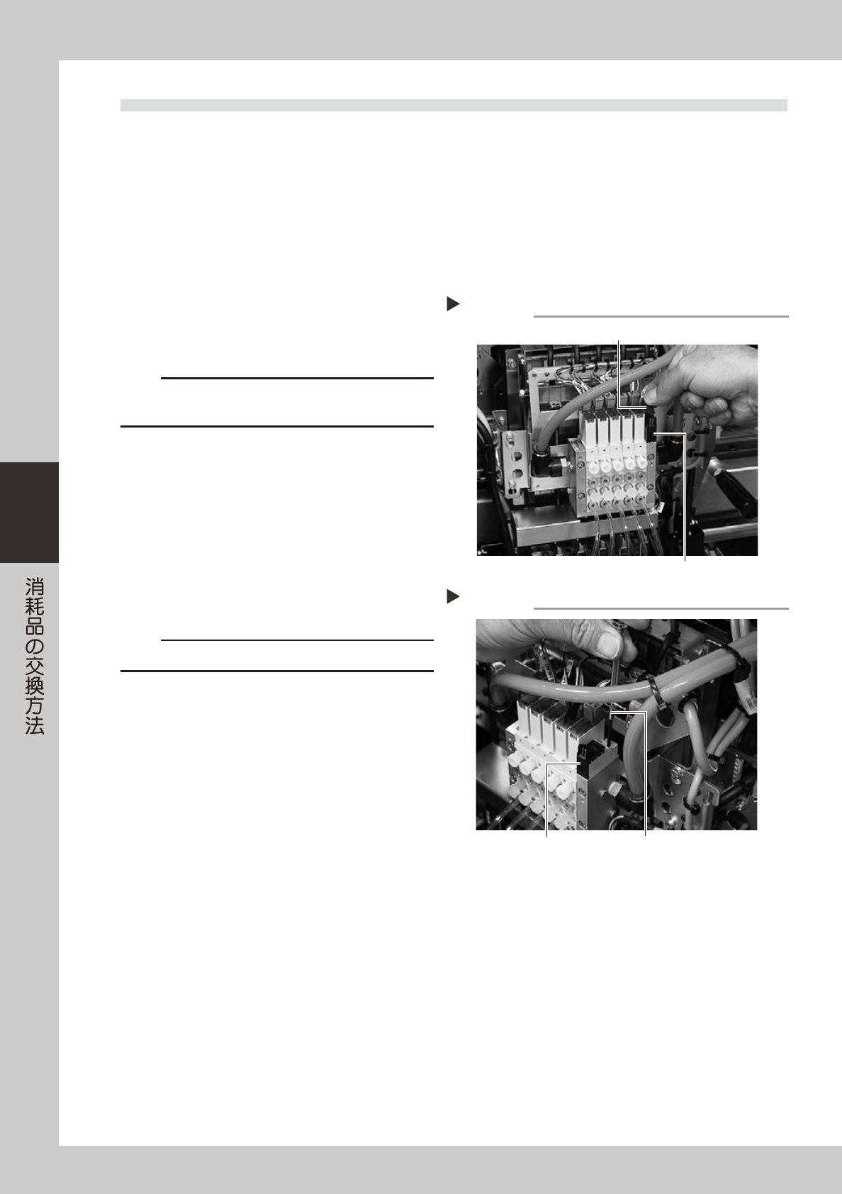4-4 4 2.3 清掃用ブローバルブの交換 1 供給エアとマシンの電源を切ります。 ソフトウエアを終了してマシンの電源スイッチを OFF にし、さらにマシン左下パネル内の「エア供 給 / 排出」スイッチを右に回してエア供給を止め てください。 2 ヘッドを作業しやすい位置まで移動し ます。 3 清掃用ブローバルブのコネクタを外し ます。 51406-L6-00 c 注意 コネクタを取り外すときはハーネスを引っ張らないように してく…
