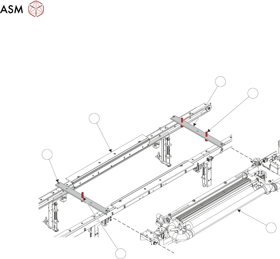 29. Place setting jig rails (1) across the machine's transport rails (6), as close to being inline with
