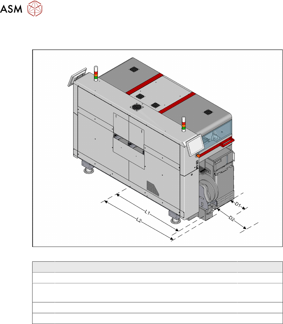 3 设备说明 3.2 技术数据 44 操作手冊 SIPLACE Tray Unit 08/2021 3.2.2 操纵距离 只能将 SIPLACE Tray Unit 装入 SIPLACE TX1/TX2 V2 的 1 号料区。 图35: 装入 SIPLACE TX1/TX2 V2 的 1 号料区的 SIPLACE Tray Unit 位置 描述 1 号料区 D1 移出 SIPLACE Tray Unit 所需的最小操纵距离。 1100…