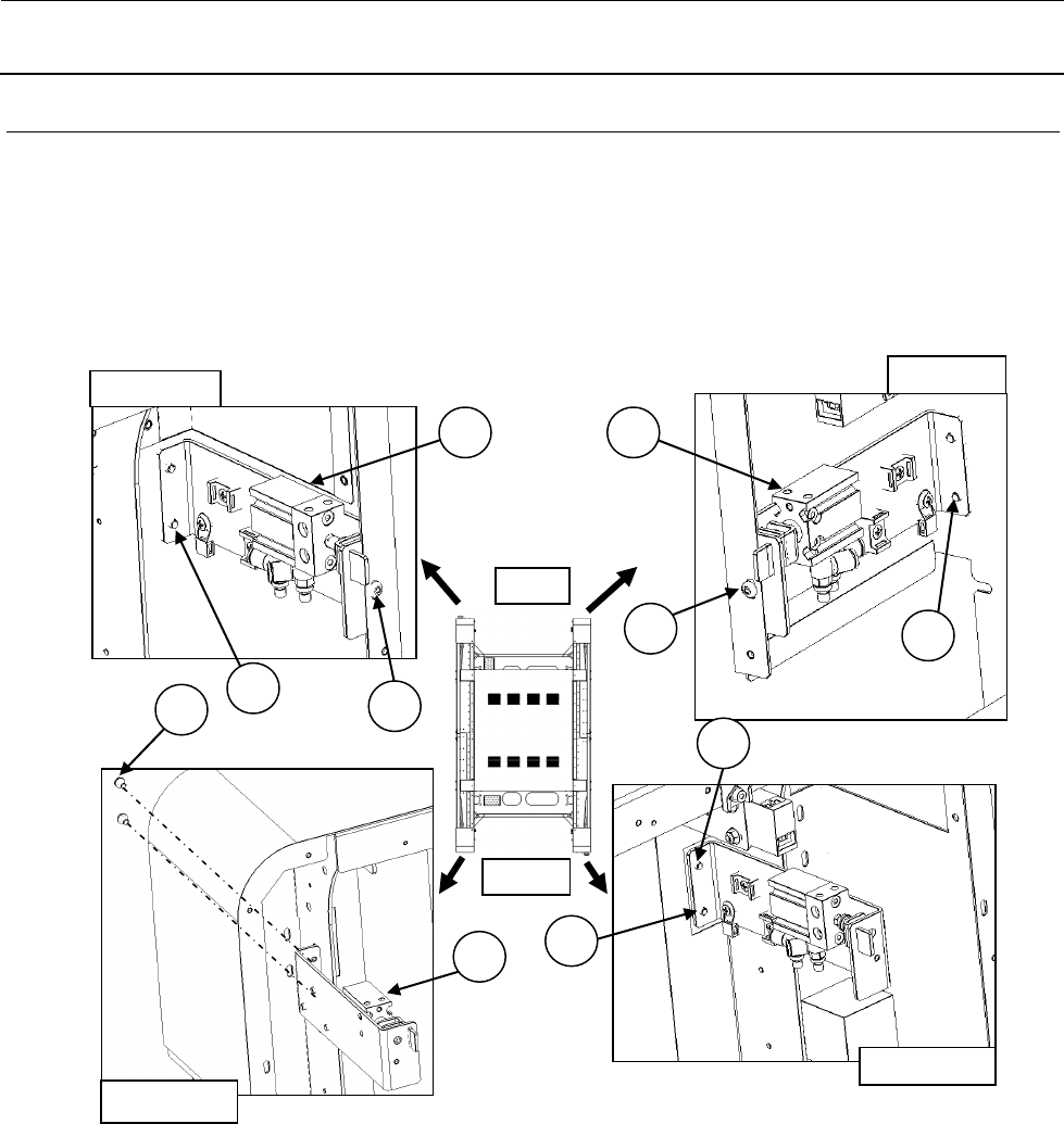 1)将①气缸制动器组件,用②螺丝暂固定在下图位置上。前侧要从外侧拧紧 2 处,后侧要从内侧