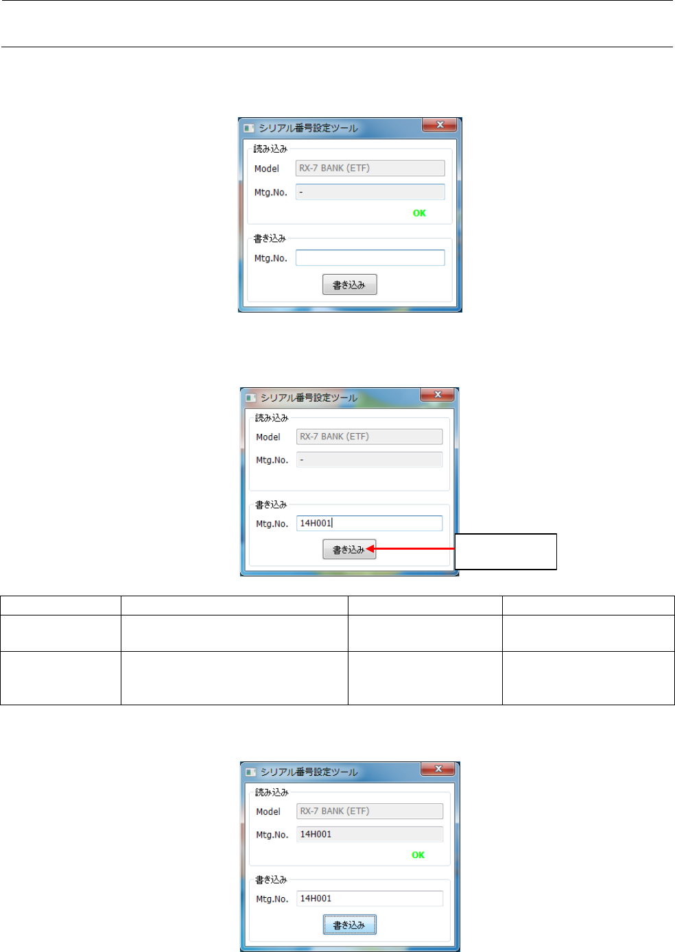 维修调整要领书 18 -7 4 . 将准 备电 源 置于 ON ,则 在 「读入 Model 」 中显示 机种 类型, 显示 OK 。 请确认 机种 类型为 「 RX - 6 BANK (***) 」 (*** 为 ETF 或 RF) 。与前述不同 时, 请确认 BANK ID 基板拨码开关的设 置。 ( 参照 p.18-5) 5 . 在下 部的 Mtg.No. 中写入 序列号 ,按下 下部的按钮。 序列号 的格式请依照以 下规定。 单…