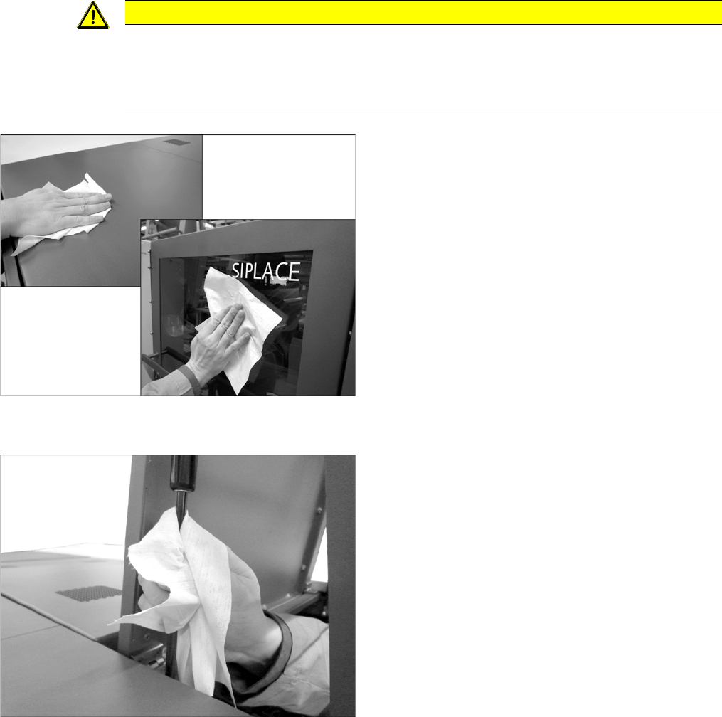 大修 贴片机主体的维护工作 5.2.2 执行维护工 作 38 预防性维护 SIPLACE X 系列 S 5.2.2.5 5 . 2 . 2 . 5 清 洁 保 护 罩 清洁保护罩 5.2.2.6 5 . 2 . 2 . 6 检 查 / 清 洁 / 更 换 保 护 盖 上 的 气 压 式 避 震 器 检查 / 清洁 / 更换保护盖上的 气压式避震器 注意 ESD 涂层 ► 在选择保护盖的清洁剂时请务必特别小心,以免 损坏保护盖的 ESD …