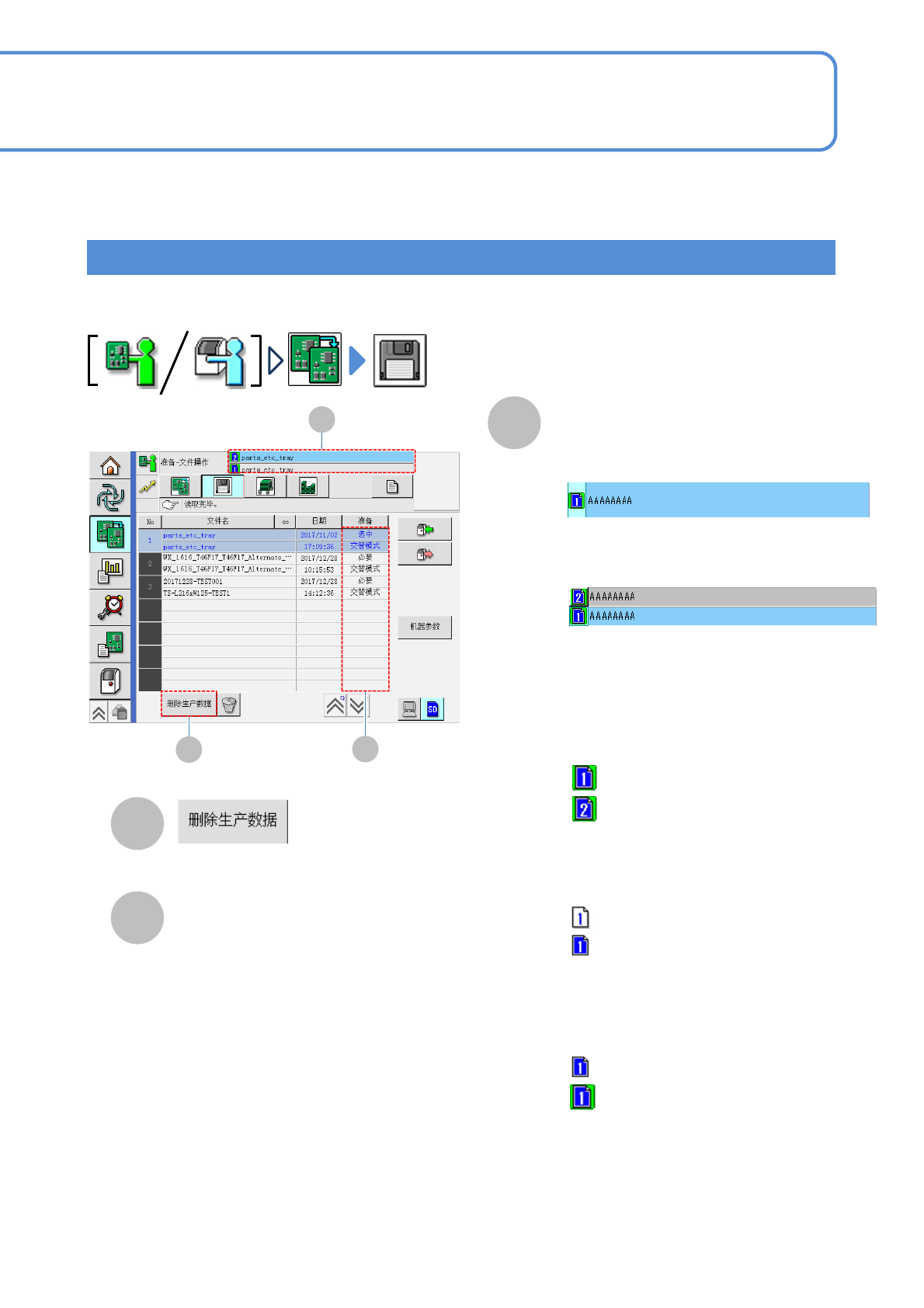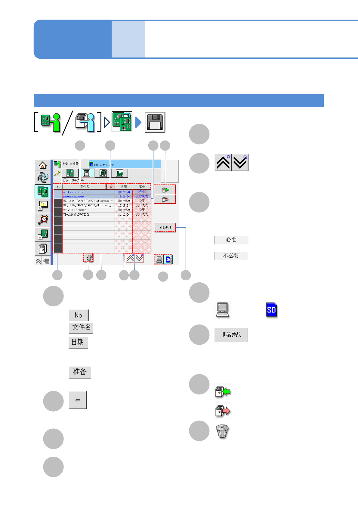 NPM-W X/WXS EJM9DC-MB-03O-0 0 A B C E F G 3-1-2 -1 准备 : 连接 LNB 。 A B C D E F G H H : LNB 画面的确认方法 / 单轨模式 D J I K K I J 文件 操作 「文件操作」画面 操作手册 3-1-2 日期 ( 显示更新日期 ) ( 显示表的前后画面 ) 准备 ●现在读入中的生产数据和供料器等 的实 际配置不一致时,显示需要切换的准 备 工作。 : 需…