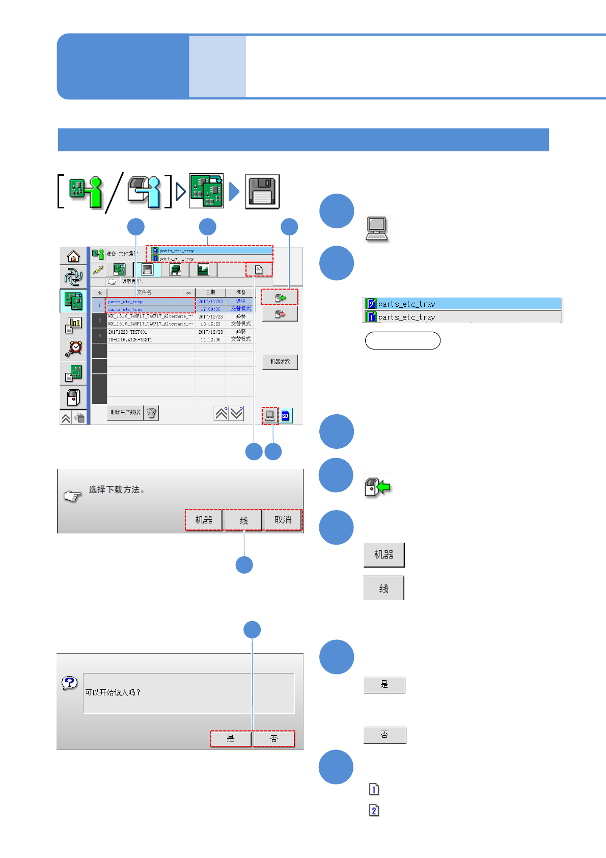 NPM-W X/WXS EJM9DC-MB-03O-0 0 3-1-3 -2 4 1 2 2 3 4 3 5 从 SD 卡传输到设备 / 单轨传送带 把 SD 卡插入设备,读入生产数据。 选择文件 插入 SD 卡 ( 参数光盘 ) 选择文件读入的来源 读入文件 确认提示 ■不读入时 : SD 卡 5