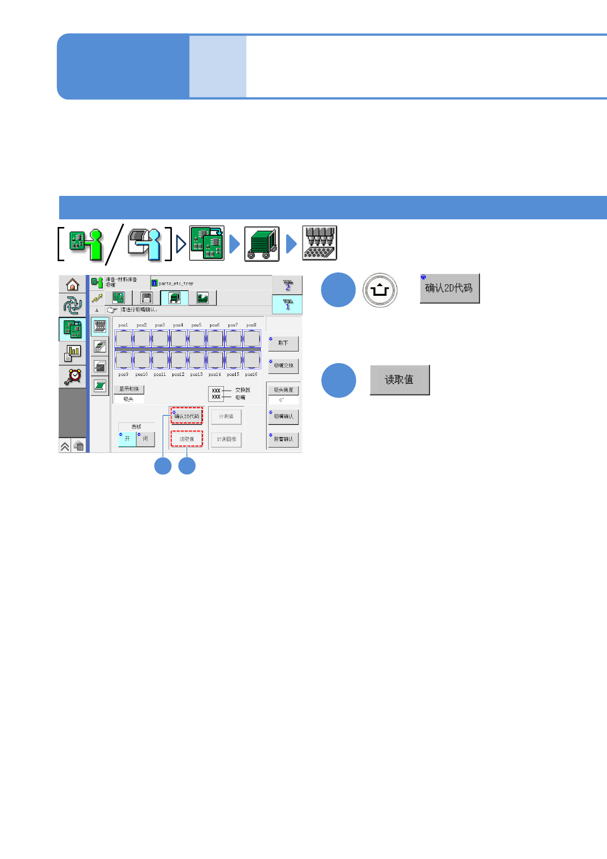 [2D代码识别]、[读取值] 按钮只有在选购件设定(→工程师手册 P.13-1-4)的“吸嘴2D代码识别”被设为ON时显示。