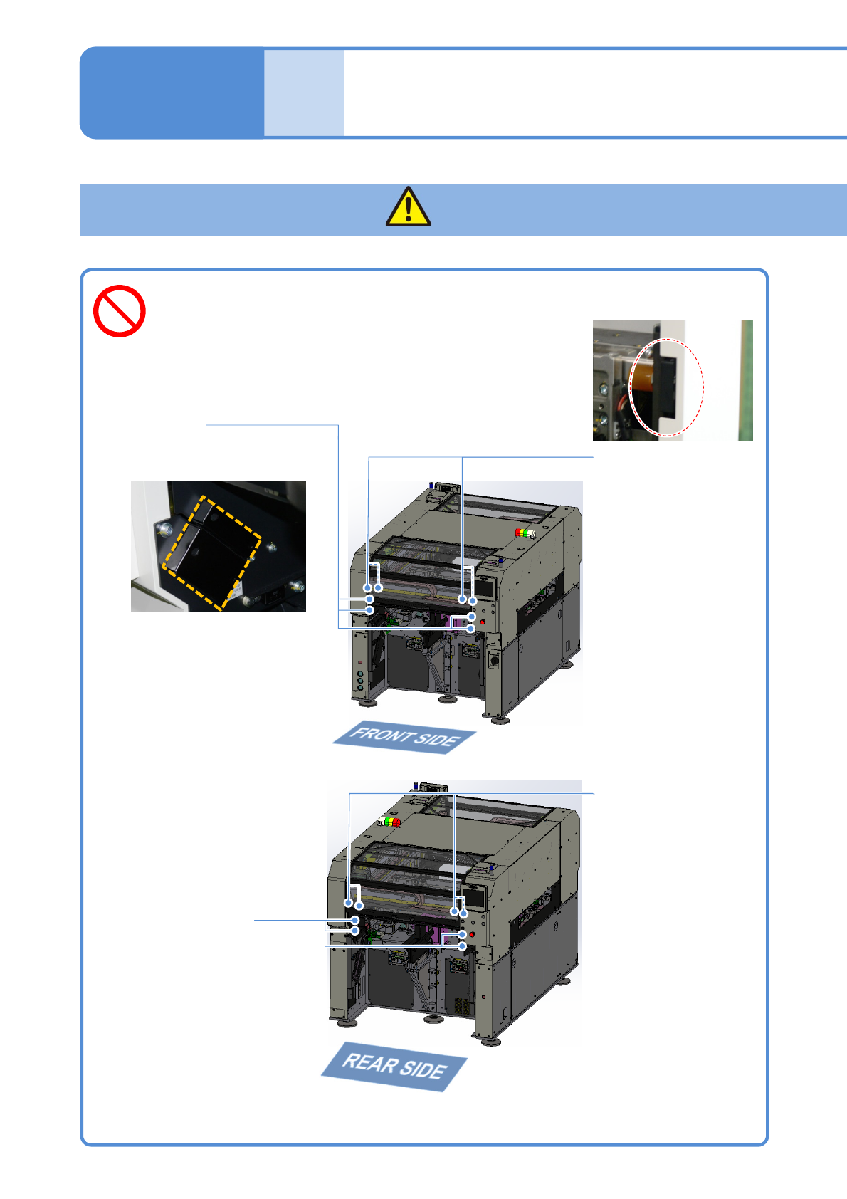 EJM9DC-SF-01C0 0-00 NPM-W X/WXS 1-1 -4 请必须遵守 ON OFF 工厂侧断路器 ON OFF 主电源开关 a 伺服开关 b OFF SERVO ON 身体部位需要进入可动部时,必须遵守以下事项 ( 有发生触电或者由于可动部运转而造成受伤的可能 ) 请根据各操作内容进行对应。 ●对电气 BOX 等进行维修保养 时 → 把连接设备的工厂侧的断路器设定为 OFF 。 ●定期检查和更换消磨零件、传感器 等电…