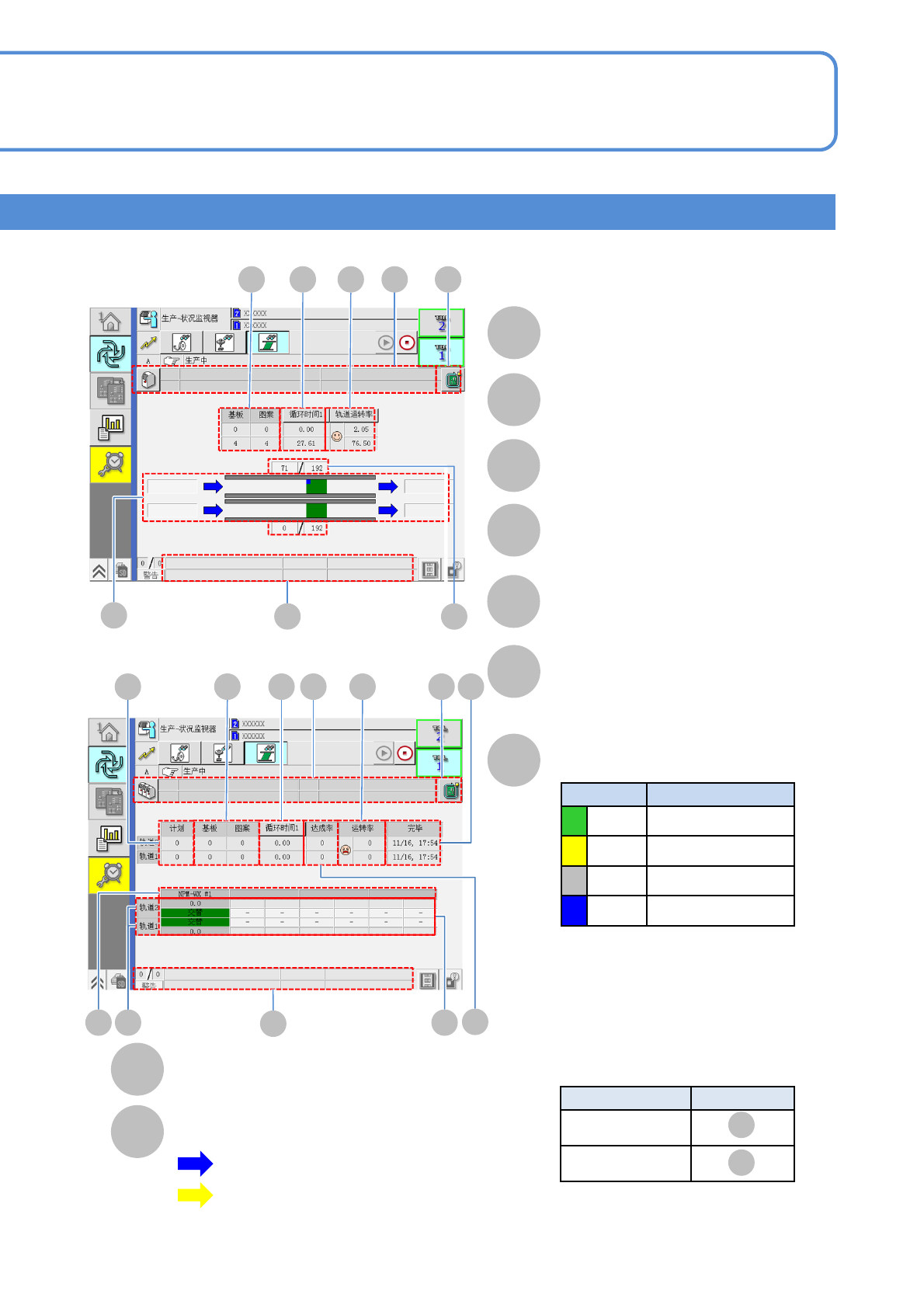 NPM-W X/WXS EJM9DC-MB-04O-0 0 生产中的画面 2 4-2-1 -3 P P Q Q 生产中、停止中的 确认方法 2 操作手册 4-2-1 生产 信息 ■ 贴装头 生产开始轨道的选择 选择开始生产的轨道 ( → P.4-1-2 -2 ) 生产停止轨道的选择 选择生产停止的轨道 ( → P.4-1-4)