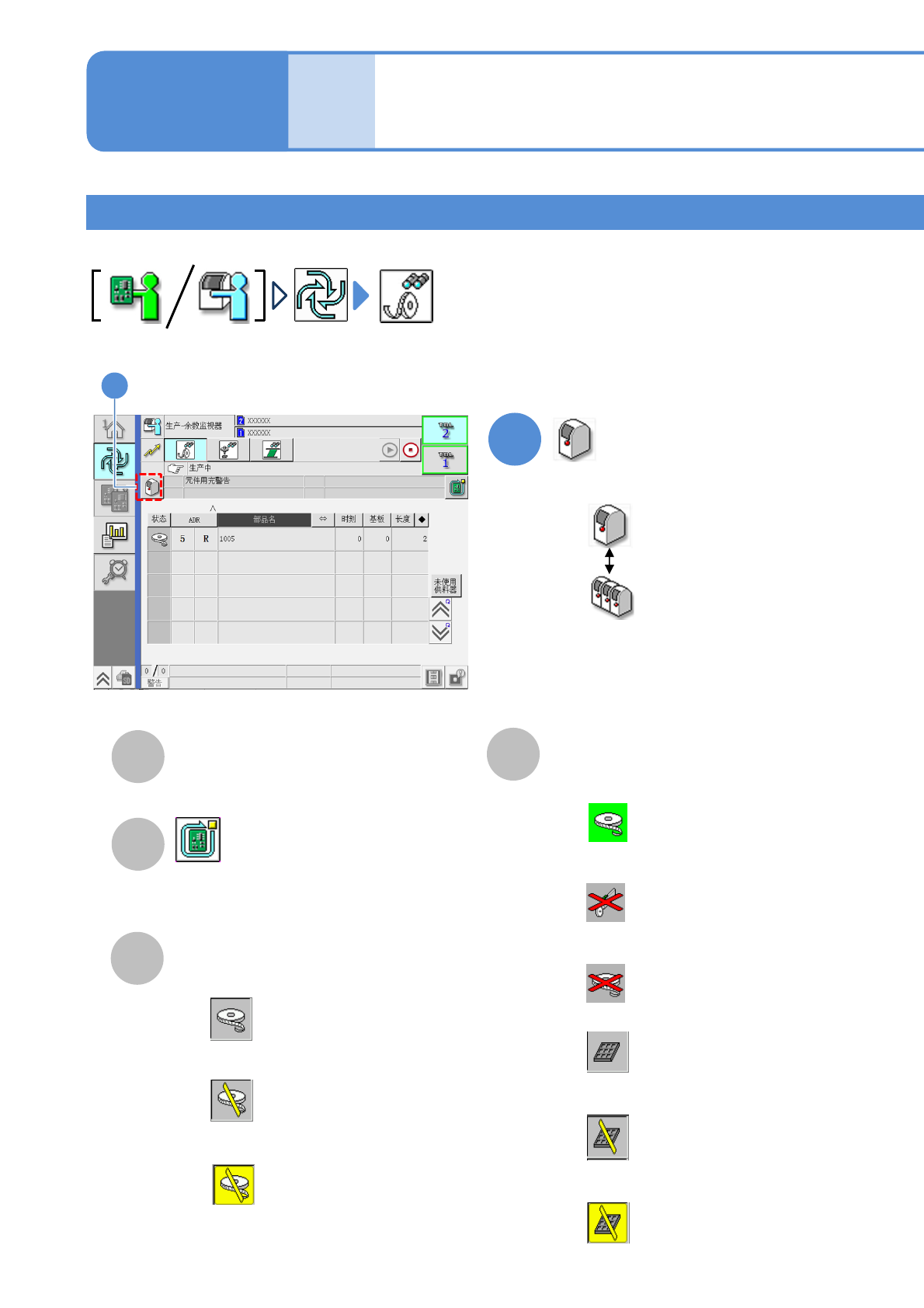 NPM-W X/WXS EJM9DC-MB-04O-0 0 D E F H G I J A B D C J I A B D C H E F G A 4-2-1 -6 ■ 设备单位 ■ 生产线单位 ADR ( 地址 ) 元件的地址。 部品名 时刻 元件用完为止的预计时间。 ●单位 : 分钟 基板 元件用完为止可以生产的基板数量。 长度 剩余的编带长度。 ●单位 :m 显示元件用完警告,因为是错误判定 可以继续生产。 未使用供料器的 LED…