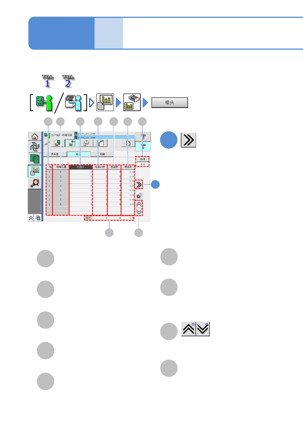 NPM-W X/WXS EJM9DC-MB-04O-0 0 4-2-4 -1 C B G H D A C H G B A E F I D E F I 1 1 ● 请全都实施。 贴装头的吸着信息 1 生产 信息 操作手册 4-2-4 可以确认各贴装头的元件吸着信息。 ( 显示错误的详细信息 ) 吸嘴位置 贴装头的吸嘴安装位置编号。 吸嘴号 吸着吸嘴的种类。 TBL ( 工作台 ) 正在参照的工作台。 吸着次数 各贴装头的吸着次数。 错误数…