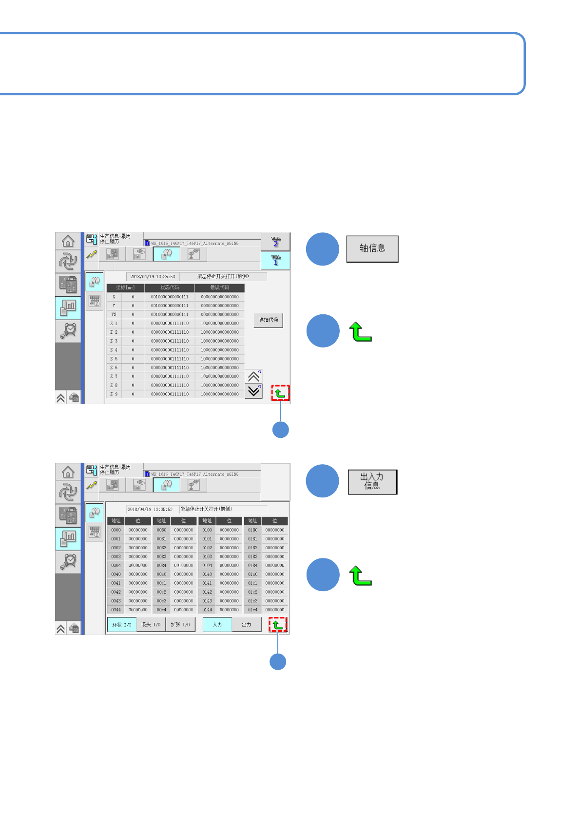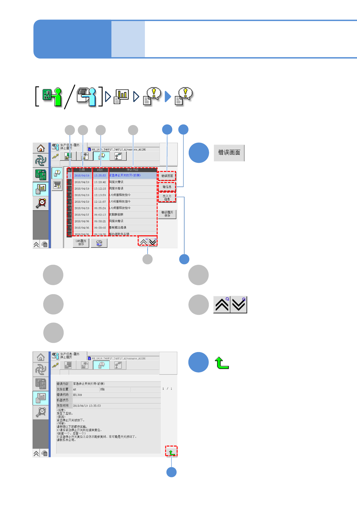 NPM-W X/WXS EJM9DC-MB-04O-0 0 4-2-6 -1 C A B D E E A D 5 3 B C 1 2 2 1 确认停止履历 生产 信息 操作手册 4-2-6 由于紧急停止错误的停止信息,按照最新顺序最多可 以确认 50 件。 ■ 停止履历画面 ( 显示发生识别错误时的画面 ) 停止内容 显示前后画面。 ( 返回到停止履历画面 ) No 数据编号。 日期 停止日期。 时刻 停止时刻。