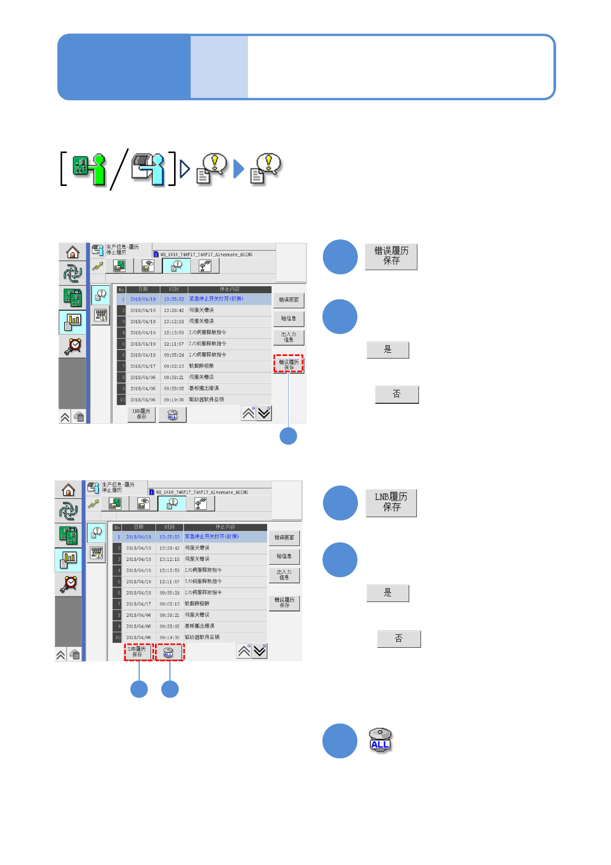NPM-W X/WXS EJM9DC-MB-04O-0 0 5 3 4-2-6 -2 4 4 6 6 所选择的错误的轴信息会显示。 ( → 『工程师手册』 P.13 -2-2) 所选择的项目发生错误时的输出入信 息 会显示。 ( → 『工程师手册』 P.13-2 -3, P.13-2-4) ( 返回到停止履历画面 ) ( 返回到停止履历画面 )