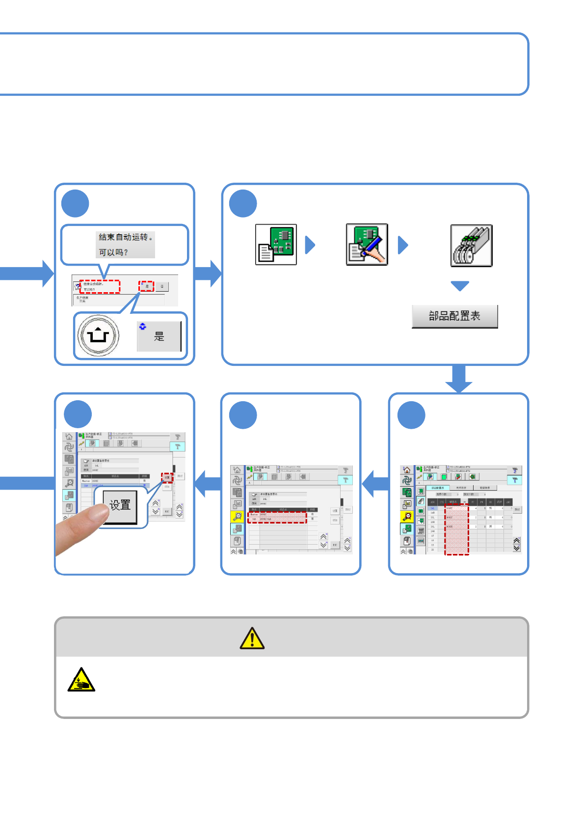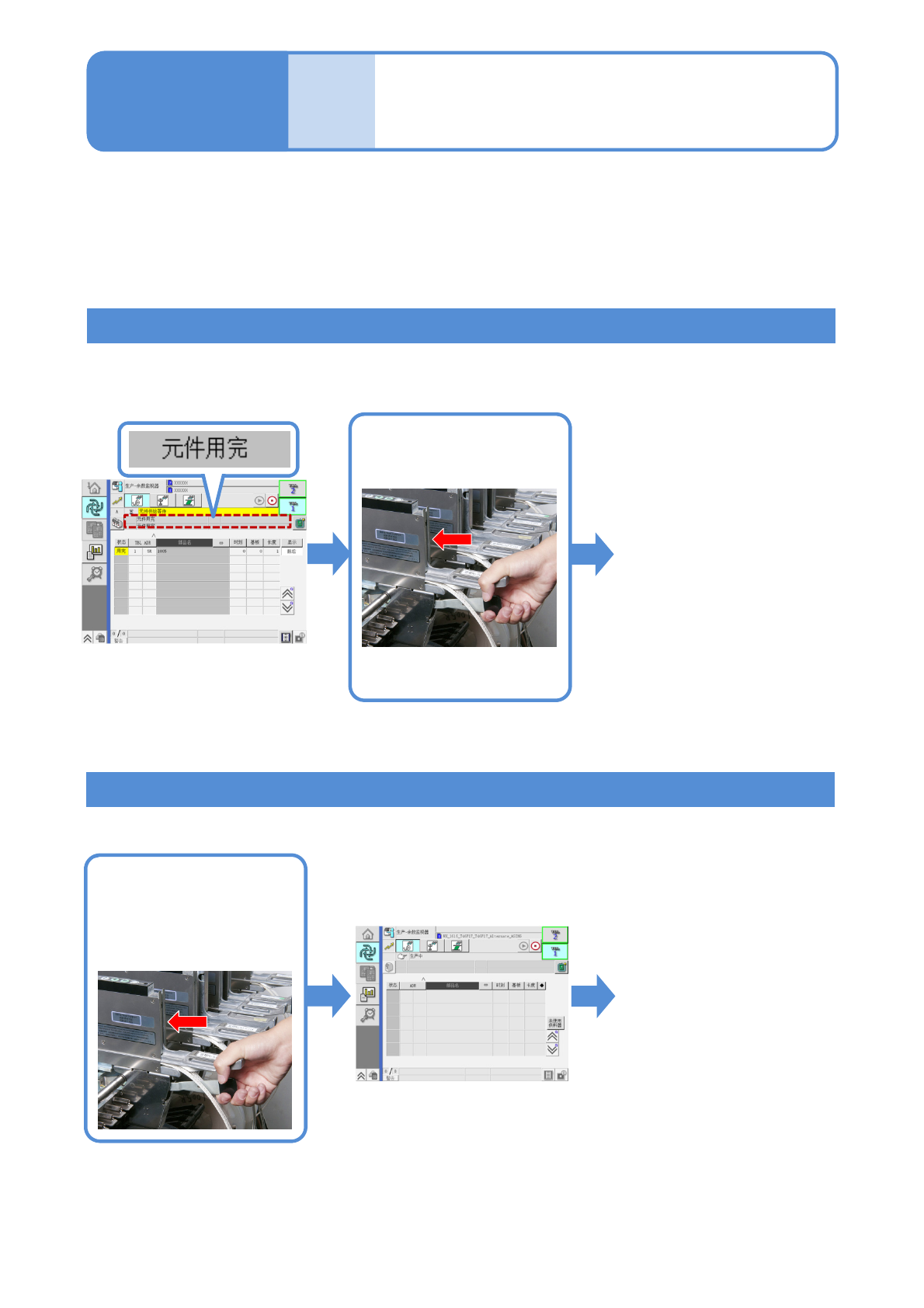 NPM-W X/WXS EJM9DC-MB-04O-0 0 4-3-1 -2 3 4 6 5 + 确认提示 进入数据修改画面 ( 数据修改 ) 从 “ 供料器 / 托盘 ” 层选择 配置表 选择主元件 ( → 『工程师手册』 P.12-1-7) 选择副元件 注意 请勿夹住手指 ( 可能受伤 ) ●安装或卸下供料器时请注意。 7 ( 元件供给处从主元件切 换为副元件 )