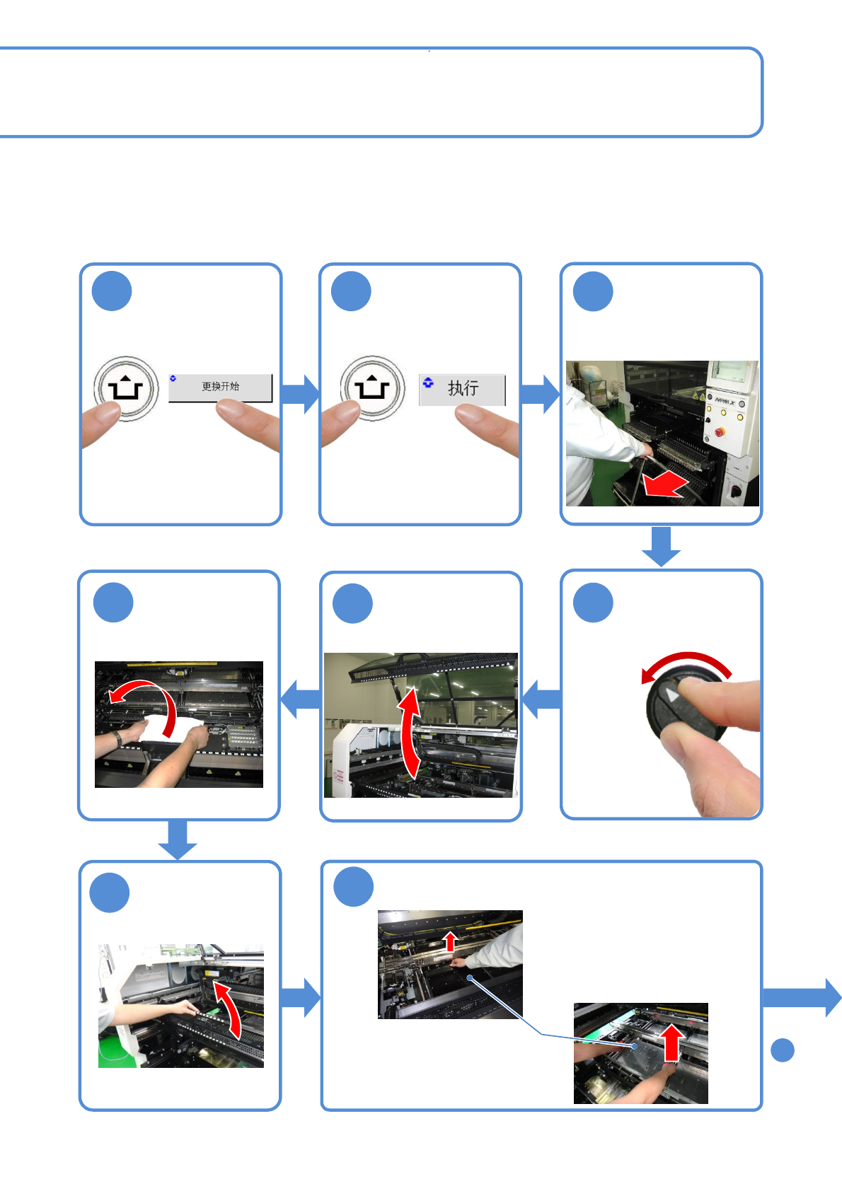 NPM-W X/WXS EJM9DC-MB-07O-0 0 1 2 7-3 -2 3 顺序 9 5 4 7 用棉纱布盖在 多功能识别照相机 V2 上 6 8 卸下交换台车 ( → P.2-4) ACTIVATION ACTIVATION 将供料器工作台盖 倒向内侧 OFF SERVO ON ● 用手指从基板支撑快的下面 往上抬,固定的锁扣就会被 解除。 选择基台后 确认提示 ●请注意不要在多功能识别照 相机 V2 (LED 照明 ) 上…