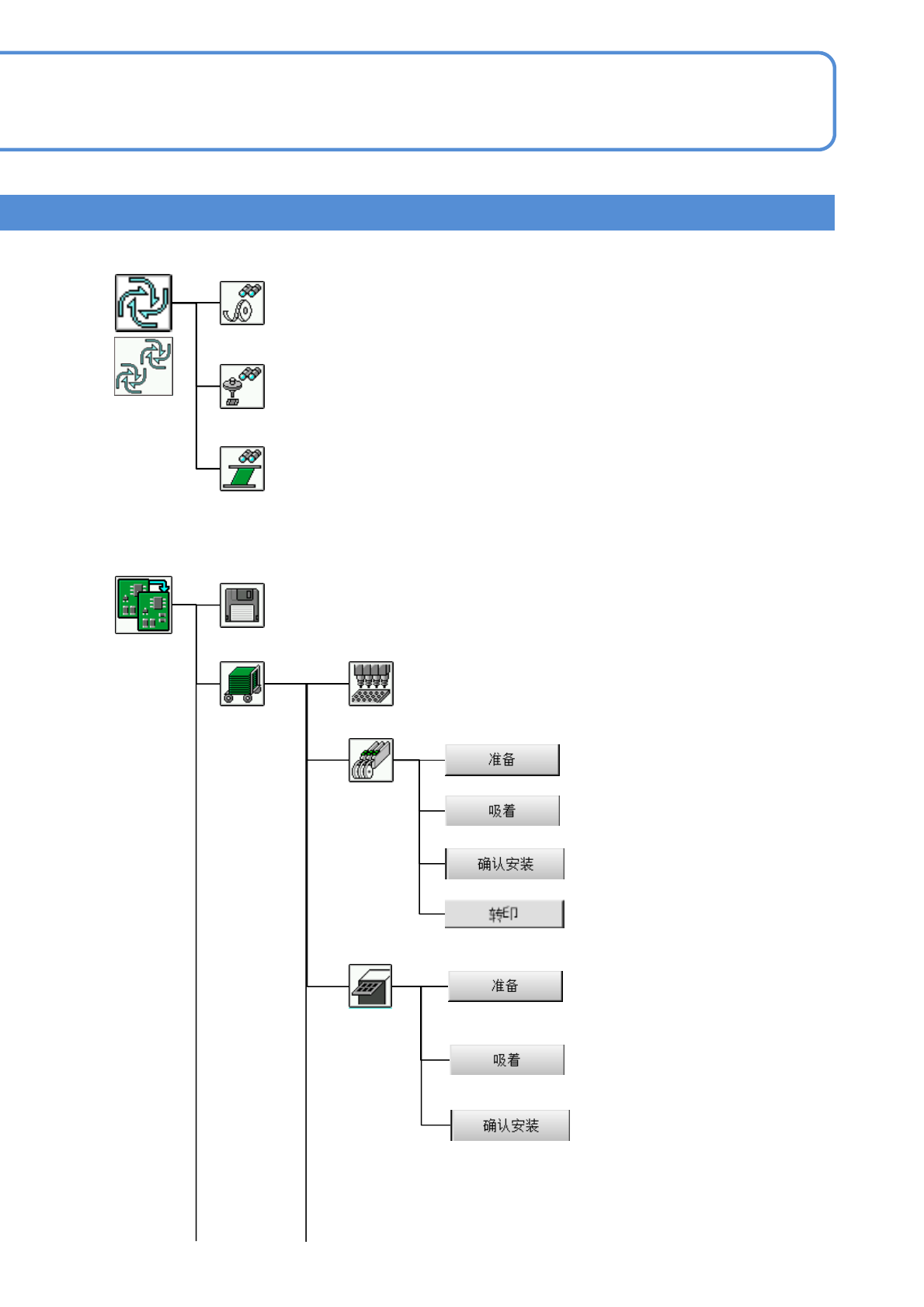 EJM9DC-MB-02C-00 NPM-W X/WXS 2-2-2 -2 准备零部件 显示各吸嘴位置的机器数据。 吸嘴 供料器 用颜色来显示生产数据和供料器状态 。 确认供料器状态。 根据各供料器地址来确认生产中的吸 着 位置学习后的补正值。 ★进行转印单元的操作。 生产菜单 ( 生产前 ) ★带有标记的图标或按钮,是在搭载 了该选购件时才显示。 ★托盘 确认托盘状态。 用颜色来显示生产数据和托盘状态。 根据各托盘地址来确认生产中的吸…