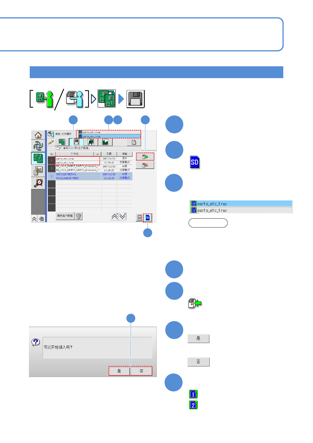 NPM-W X/WXS EJM9DC-MB-03O-0 0 经由 LNB 从 DGS 传输到设备 / 双轨模式 1 2 3 3-1-3 -3 5 6 3 4 2 4 7 7 1 6 5 文件 操作 生产数据的读入 2 操作手册 3-1-3 分别读取轨道 1 、轨道 2 的生产数据。即使在属于相同种类 的情形下,也请分别读取生产数据 。 选择文件读入的来源 : LNB ● 通过按下轨道区域,来选择轨道。 选择轨道 选择读取处 选择文件 注…