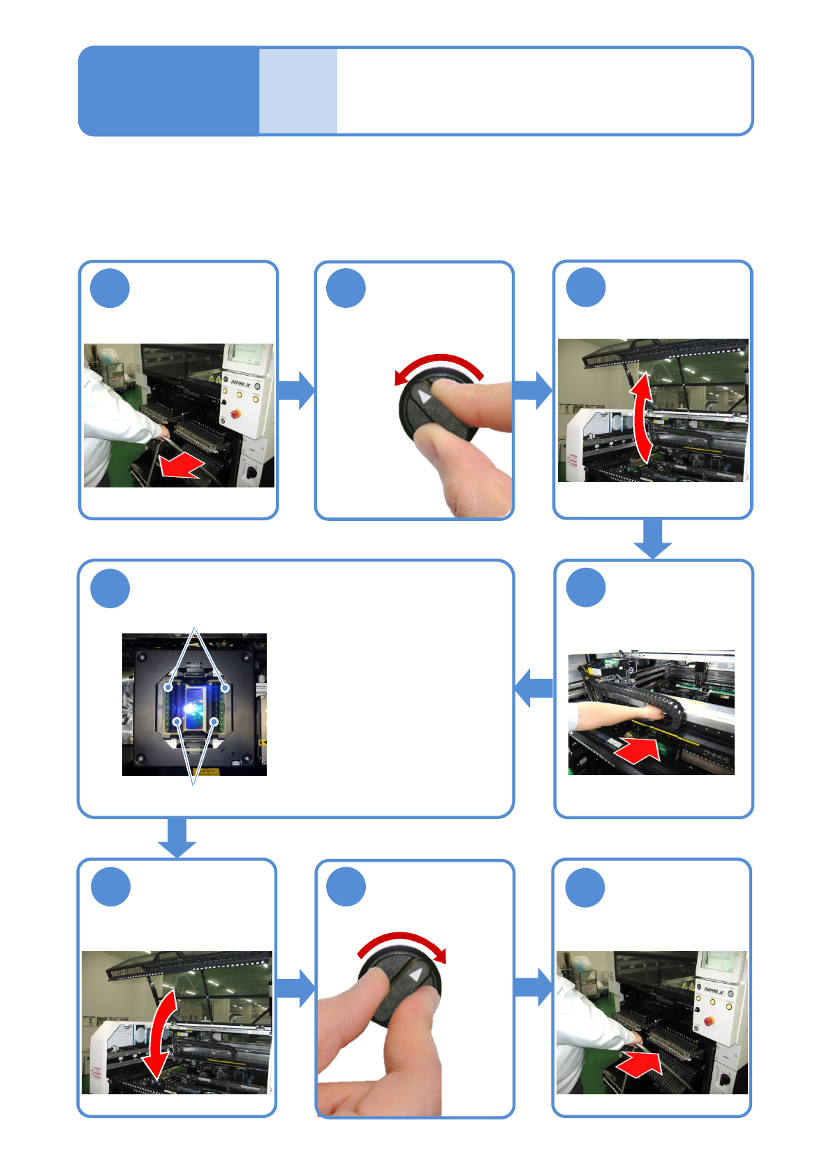 NPM-W X/WXS EJM9DC-MB-07O-0 0 ACTIVATION 7-4 -4 17 注意 ●清扫基板支撑块时,请同时确认支 撑销的状态。 ( 如果支撑销尖端部留有助焊剂时,请使用棉纱布擦拭 。 ) 确认提示 ( 确认基板支撑块下降到 原点 )