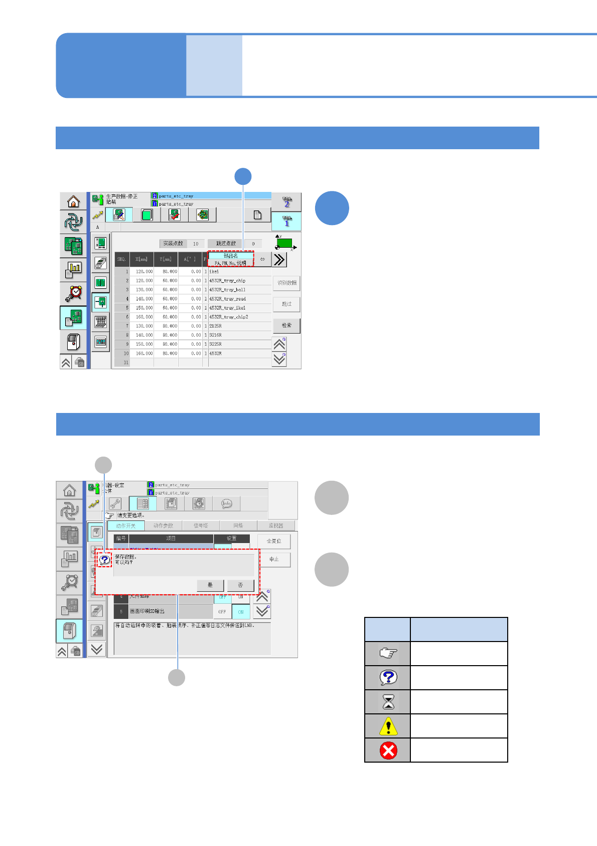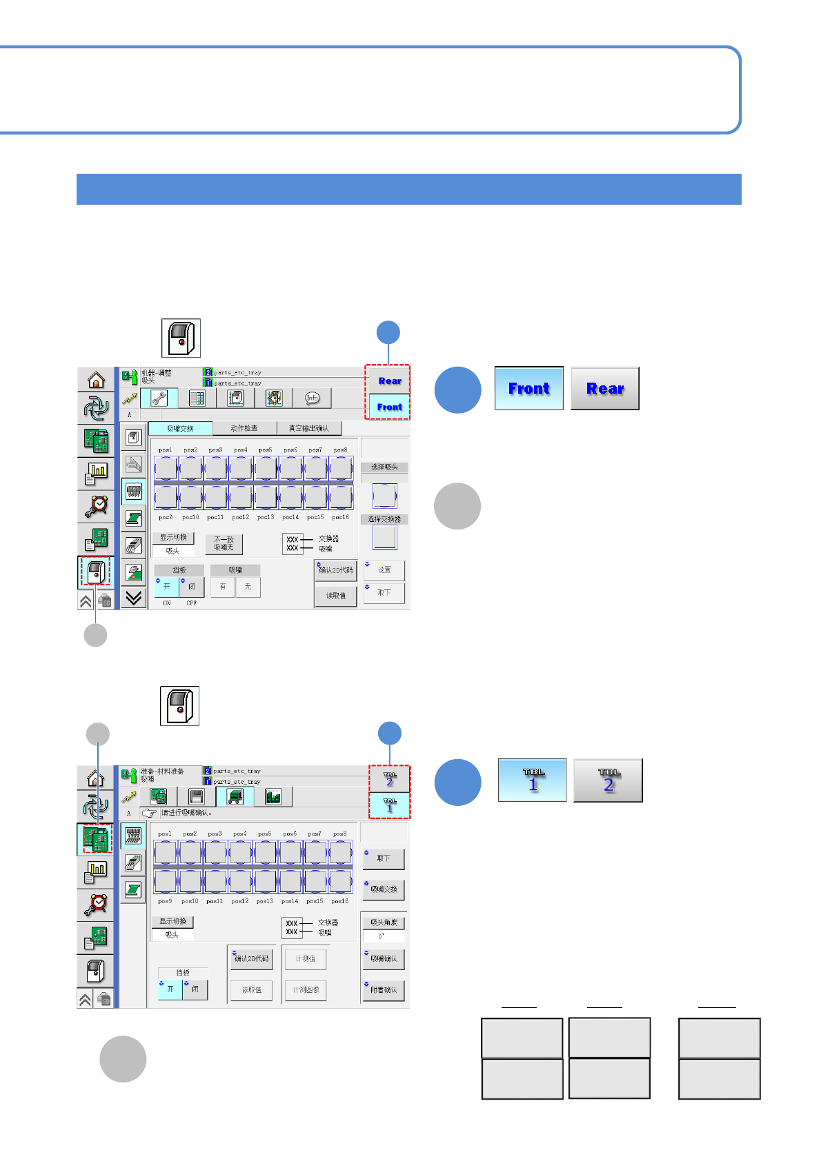 EJM9DC-MB-02C-0 0 NPM-W X/WXS 工作台 / 基台的切换显示 2-2-1 -6 1 1 1 1 A B 第 N 台 … A B TBL 2 TBL 1 TBL 2N TBL 2N-1 … … TBL 4 TBL 3 NPM-WX 在前后配置了 XY 单元,是用画面右上侧的按钮进行操 作的切换。 有关工作台的切换键,根据以下条件 会有变化。 ●所选择的第 1 层的按键 ●设备连接为生产线时所处的位置 ■基台的切换…