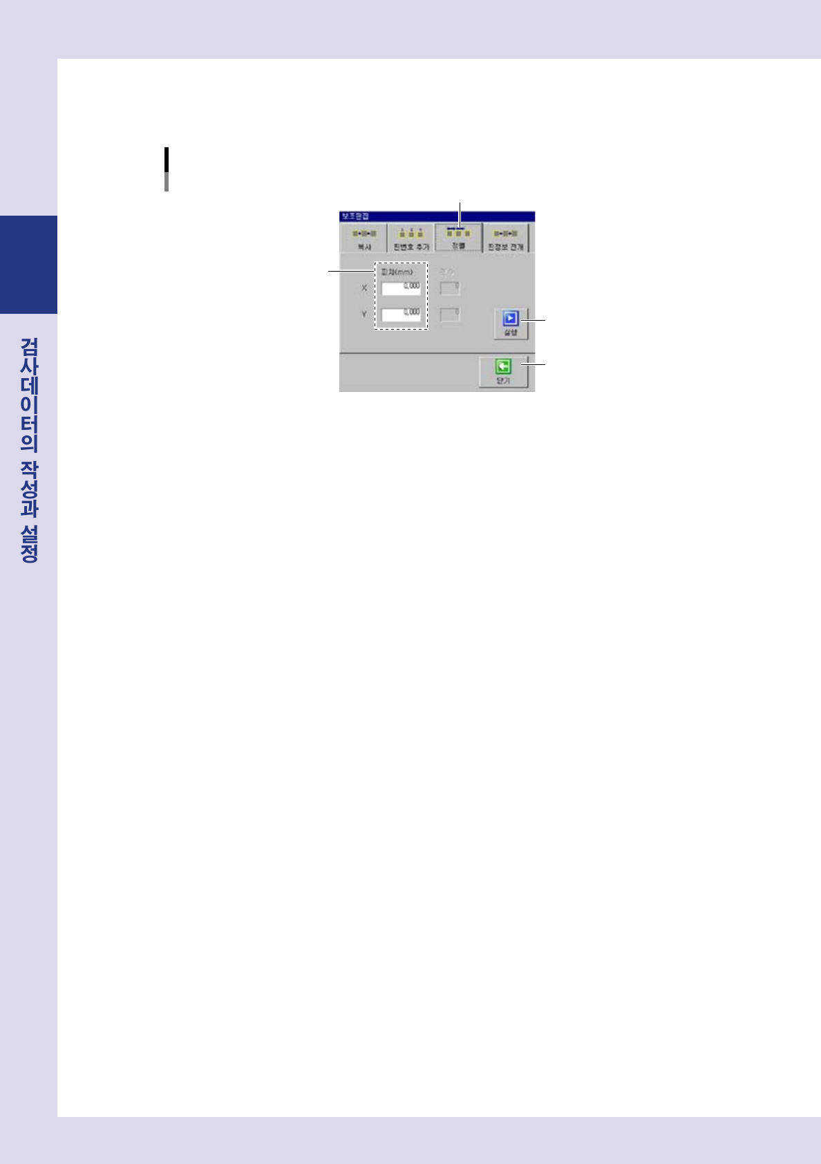 2-50 2 7. 9 . 3 정렬 스 탭 위치 를 동일 라인 에 동 일 피치 로 정 렬 할 수 가 있 습니 다 . 「정렬」화면 Step 4 Step 5 Step 6 Step 3 28256 -P 9- 0 0 1 스탭을 선택합니다 . [ 검 사 데 이 터 ]- 「 스탭 」 화 면 에서정 렬시 킬스 탭 을선 택 합니 다 . 2 [ 보 조편집 ] 버튼 을 누 릅니다 . 「 보조편 집」 화면 …