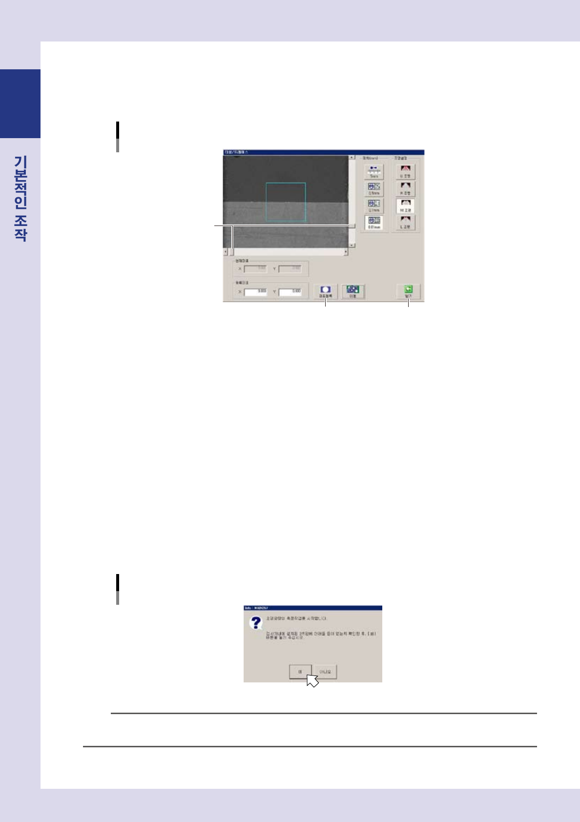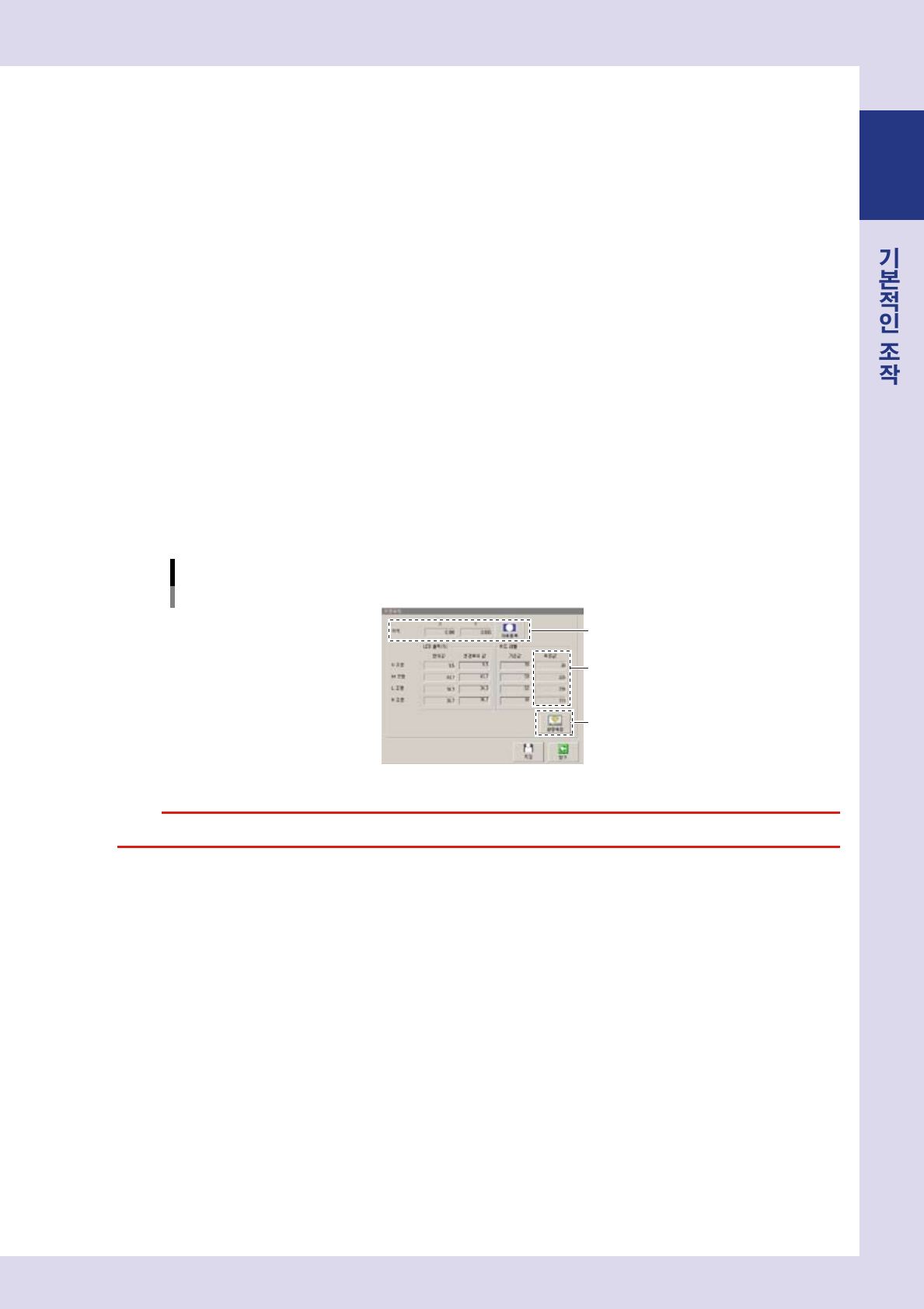 「장비설정」화면의 [ 조명교정 ] 버튼을 누르면 ,「조명교정」화면이 표시됩니다 .