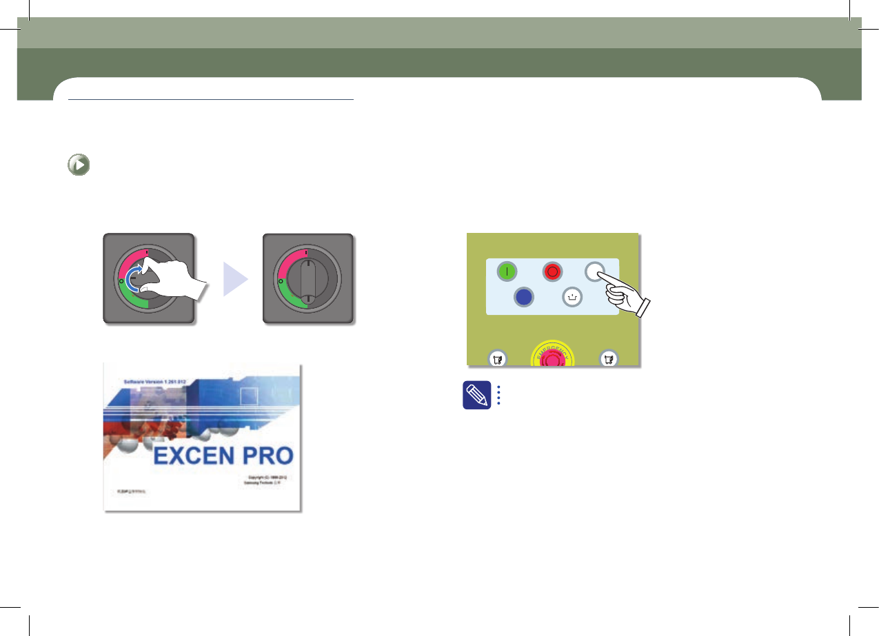 第 2 章 本 Chapter 说明电源供应方法及生产之前的暖机方法。 电源供应及暖机 High Perform ance Modular Mounter EXCE N PRO O pe ra tio n Han db oo k 2-4 生产前 准备程序 > 初始化 (Ho min g) 生产前准备程序 电源供应及暖机 4. 初始化 (Ho ming) Step 1. 确 认设 备 的 ' R E A DY '…