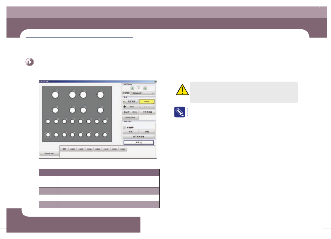 EXCE N PRO O pe ra tio n Han db oo k 3-4 第 3 章 本 Chapter 主要介绍生产作业顺序。 生产 High Perform ance Modular Mounter 准备生产 Ⅰ > 在A NC孔上配置 吸 嘴 准备生产 Ⅰ 生产 ◈ 高 精密贴装 头用 24 孔 Hole No. 用途 适用吸嘴 1~16 一般吸嘴及订制型特殊 吸嘴用孔 CN020, CN030, CN040, CN…