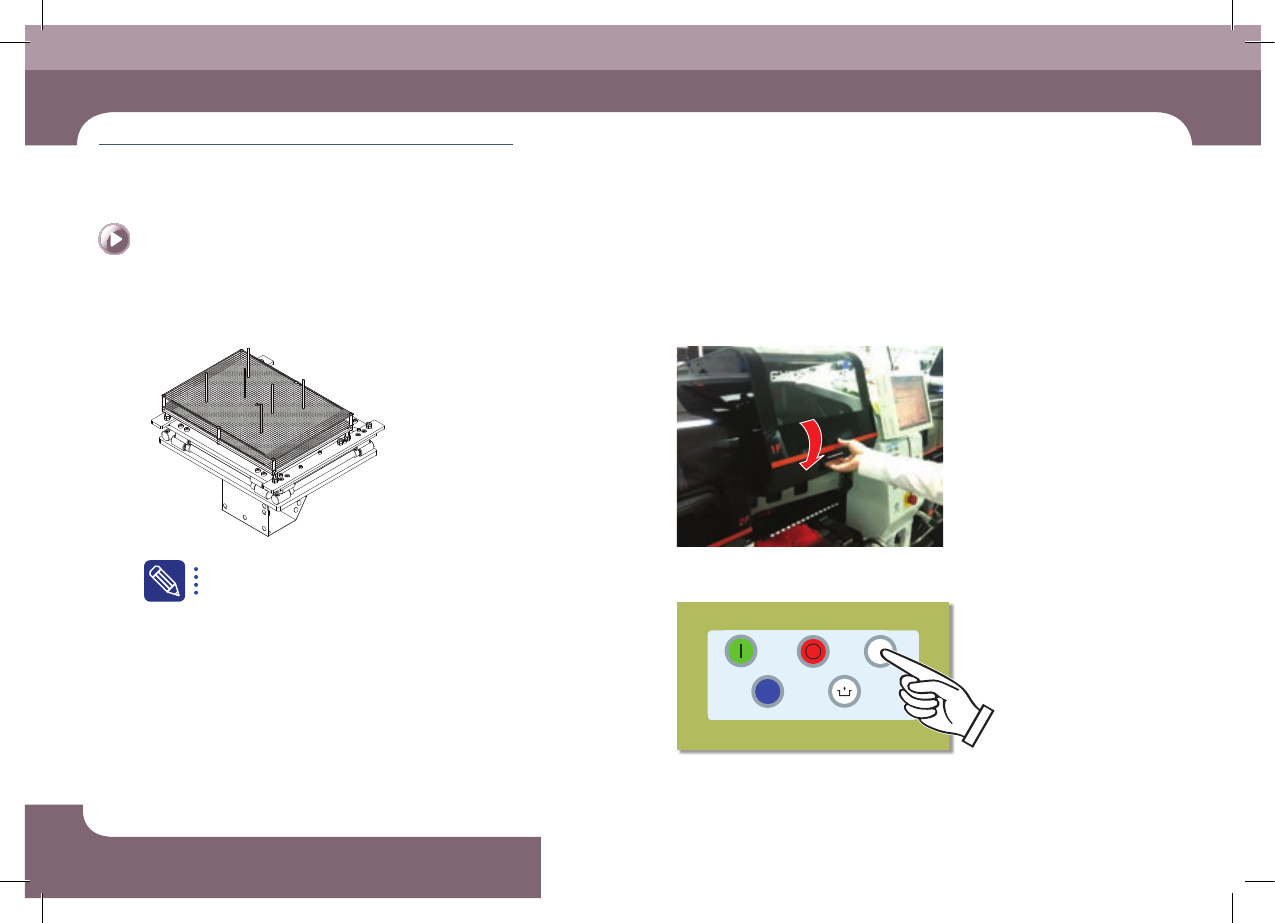 EXCE N PRO O pe ra tio n Han db oo k 3-1 8 第 3 章 本 Chapter 主要介绍生产作业顺序。 生产 High Perform ance Modular Mounter 准备生产 Ⅲ > 安装 顶块 (Ba ckup Pin) 准备生产 Ⅲ 生产 Step 5. 安装顶块 ( B ac kup Pi n) 。 关于顶块 (Backup Pin) 安装的详细内容,详见 " 设置…