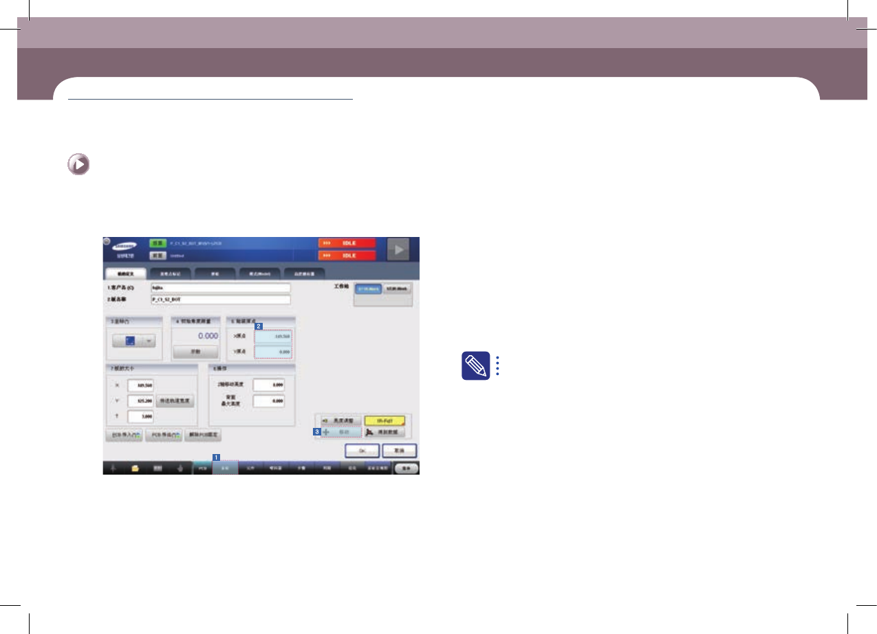 EXCE N PRO O pe ra tio n Han db oo k 3 -2 0 第 3 章 本 Chapter 主要介绍生产作业顺序。 生产 High Perform ance Modular Mounter 准备生产 Ⅲ > 检查位置及示教 准备生产 Ⅲ 生产 Step 3. 检查 P CB 基 准 标 记 位 置。 1 2 4 5 3 ① 单击<基准符号>键。 ② 在 <2. 标记位置 > 领域…