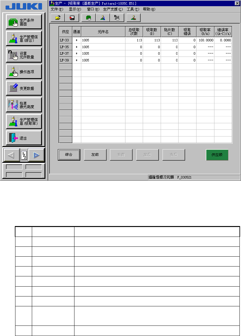 操作手册Ⅱ 吸取率显示画面的各种按钮有如下功能。 No 按钮 内容 1 综合 显示左 / 右前、左 / 右后的送料器吸取率。 2 左前 显示左前侧送料器的吸取率。 3 右前 显示右前侧送料器的吸取率。 4 左后 显示左后侧送料器的吸取率。 5 右后 显示右后侧送料器的吸取率。 6 供应顺 吸取率顺序 错误率顺序 (1) 供应顺序 逐一显示各供应装置。 选择 [ 综合 ] 时,按左前,右前,左后,右后的顺序显示。 (2) 吸取率顺序 按吸…